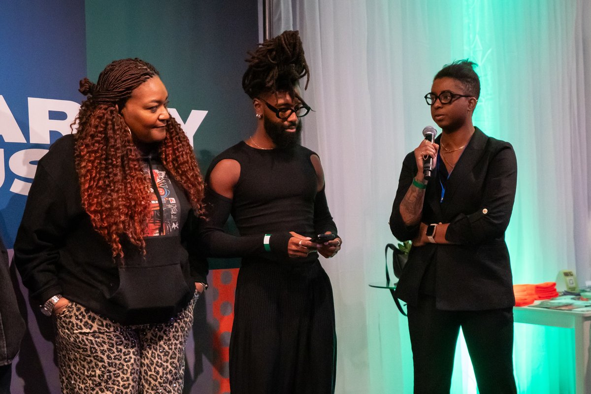 Jasmine Heyward (right) speaks at Solidarity House's closing gathering, alongside Aisha Goss (Center for Cultural Power) and Elijah McKinnon (OTV).