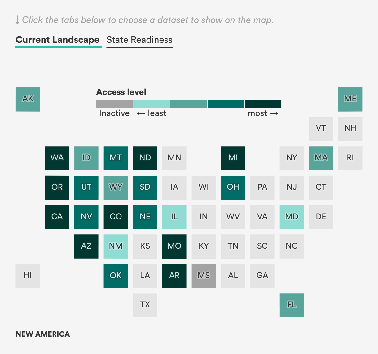 In the map below, the “Current Landscapes” tab shows the status of initiatives and referenda in the states that currently have some type of direct democracy at the state level. We categorized each of these states by the level of access they provide to direct democracy and the barriers they impose to actually using initiatives or referenda. States without any state-level direct democracy mechanism are shown in gray. For these states, the “State Readiness” map shows the degree to which they may be poised for adopting citizen-initiated ballot measures based on a scoring system that incorporates various indicators capturing the feasibility of adoption and the potential impact on democracy and governance. For more information on this score, see the Methodology section below.
