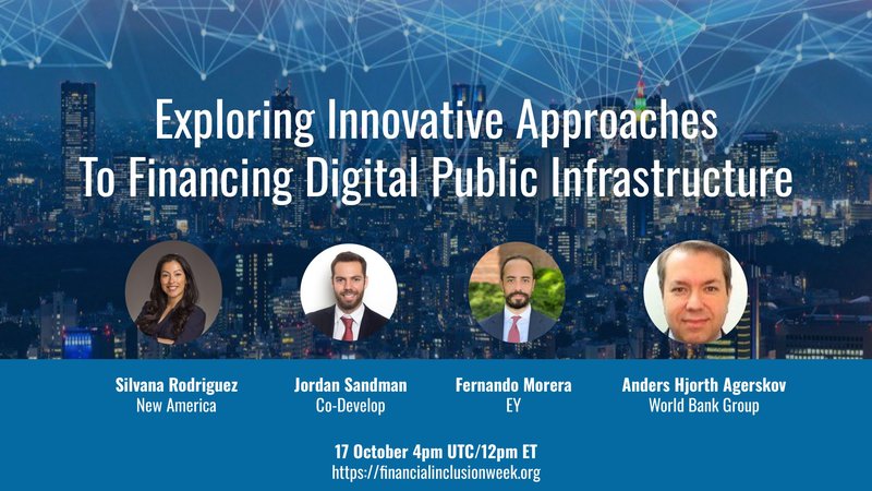 A cross-sector group of panelists recently came together at Financial Inclusion Week 2023 to discuss some of the most pressing sticking points from their respective sectors, drawing on their joint report, Financing Digital Public Infrastructure: Approaches to Sustain Digital Transformation. Report co-authors Silvana Rodriguez from New America, Fernando Morera from EY and Jordan Sandman from Co-Develop were joined by senior public sector expert Anders Hjorth Agerskov from the World Bank Group to highlight the following major obstacles: