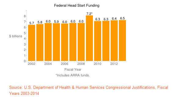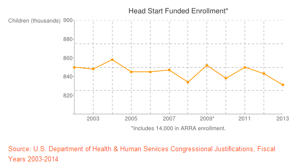 The Congressional Justifications typically contain details on the president’s latest proposals, but they also include a wealth of information about existing programs. According to the documents, Head Start and Early Head Start declined in enrollment between 2012 and 2013, before an across-the-board budgetary cut resulted in the elimination of seats in some centers around the country. Meanwhile, funding for each program increased slightly before the implementation of this year’s federal sequester.