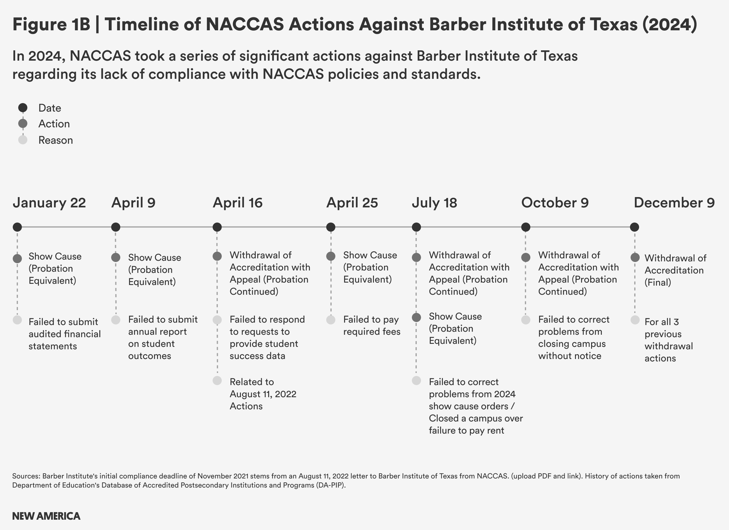 Another example of NACCAS’s problematic approach is its handling of the Barber Institute of Texas, which lost accreditation in December 2024. NACCAS demands that college programs graduate at least 50 percent of students, that 70 percent pass licensure tests, and that at least 60 percent find jobs after leaving school.