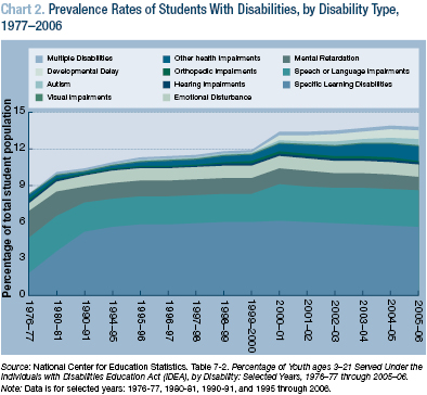 Overall, the percent of students with disabilities in theUnited States has grown from just over 8 percent of the total student population in 1977 to nearly 14 percent in 2006. But this increase has not been uniform across all disability types. The biggest increases have been in the "specific learning disabilities" category, which grew over 200 percent during this time; the "other health-impairments" category, which began to increase in 1991 when the federal definition was expanded to include ADD and attention deficit hyperactivity disorder (ADHD); and in autism, which has increased partly due to an expanded definition that includes children with milder forms of the disorder.4
