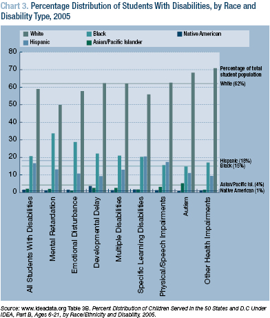 Over-identification is a particularly important issue because of the over-representation of minority students in a number of special education categories. Chart 3 shows the proportion of students of each disability type by racial category. The horizontal lines represent the percentage of each race in the total student population. Where a bar for a particular race exceeds that group's line, the race is over-represented in that disability category.
