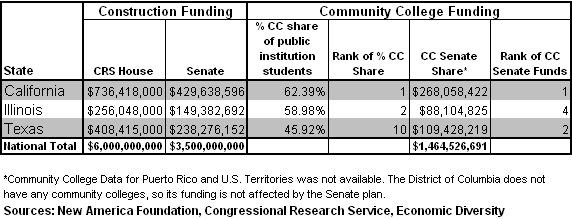 Community colleges, however, could potentially get more construction money under the Senate's plan. The Senate bill requires states to allocate a share of construction funding equal to the percentage of their students at public institutions that attend community colleges. This assures community colleges will at least get their fair share of funds.