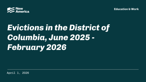 Please join New America and January Advisors at 11 am ET on Wednesday, April 1st for a 30-minute briefing and Q&A session on a forthcoming data analysis on DC evictions. Findings cover annual eviction trends in DC spanning pre-pandemic to today and a detailed exploration of eviction filings between June 2025 and February 2026, building on a prior New America analysis published in November 2025.