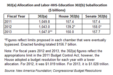 Then yesterday, the House Appropriations Committee passed its 302(b) subcommittee allocations for 2013. The House 302(b) allocation to the Labor-HHS-Education subcommittee is $150.0 billion, $7.7 billion below the Senate’s allocation. However, the House 302(b) actually provides nearly $11 billion more to the Labor-HHS-Education subcommittee than House Republicans first proposed for last year’s fiscal year 2012 allocation ($139.2 billion). Note that enacted funding for programs covered by the bill was higher, $156.8 billion, after the House and Senate negotiated a final bill.