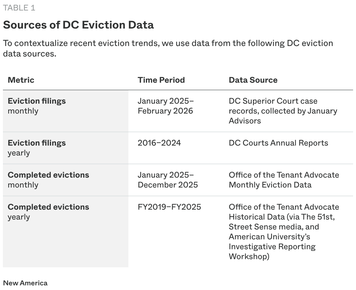 The detailed eviction filing analysis covering June 2025 through February 2026 uses data collected from the DC Superior Court. Starting in June 2025, January Advisors began conducting automated collection of publicly available residential eviction case records from the Superior Court’s online portals, including the names and addresses of plaintiffs, case filing dates, and information related to legal actions taken during the case. Note that the filing data includes all eviction filings, even if repeat filings against the same household. January Advisors extracted key pieces of information embedded within forms that landlords file with the court, including the total amount owed at the time of filing. Underlying data on renter households is from the U.S. Census Bureau’s American Community Survey 5-year estimates, 2019–2023, unless otherwise specified.