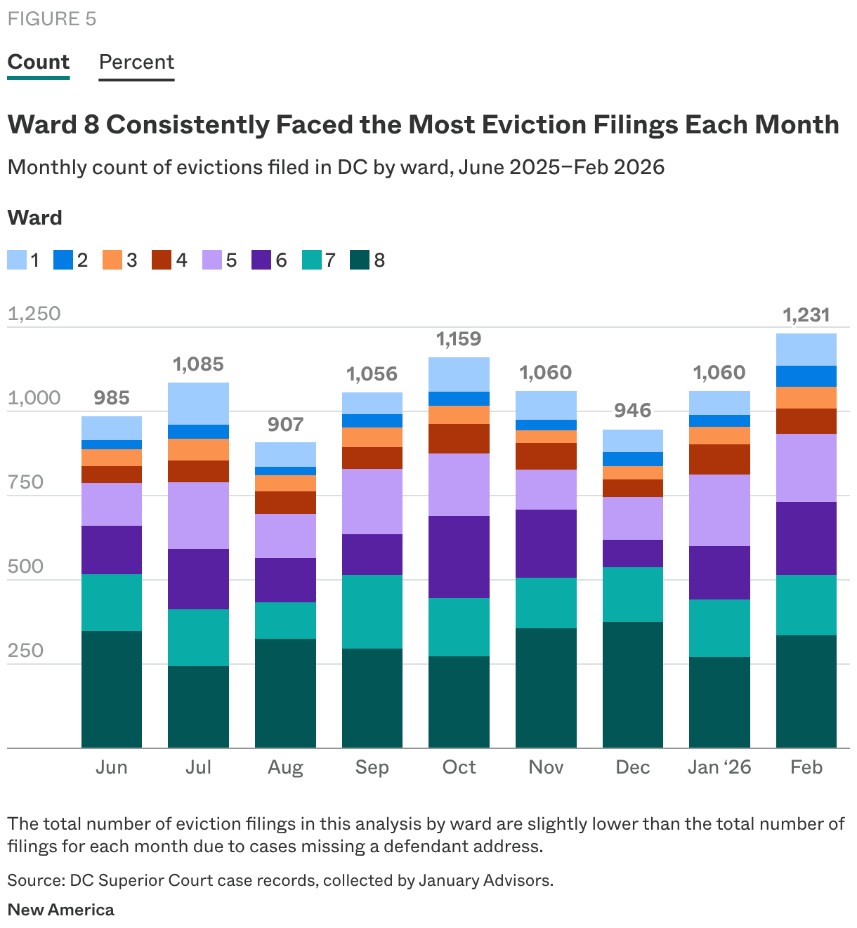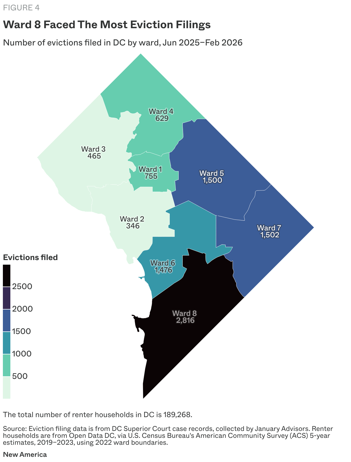 Hardest-hit wards: Between June 2025 and February 2026, Ward 8 had by far the highest number of eviction filings (2,816 filings), followed by Ward 7 (1,502 filings), Ward 5 (1,500 filings), and Ward 6 (1,476 filings), as shown in Figure 4. Ward 8 saw nearly four times as many filings as Ward 1 over this nine-month period, and about eight times as many filings as Ward 2.
