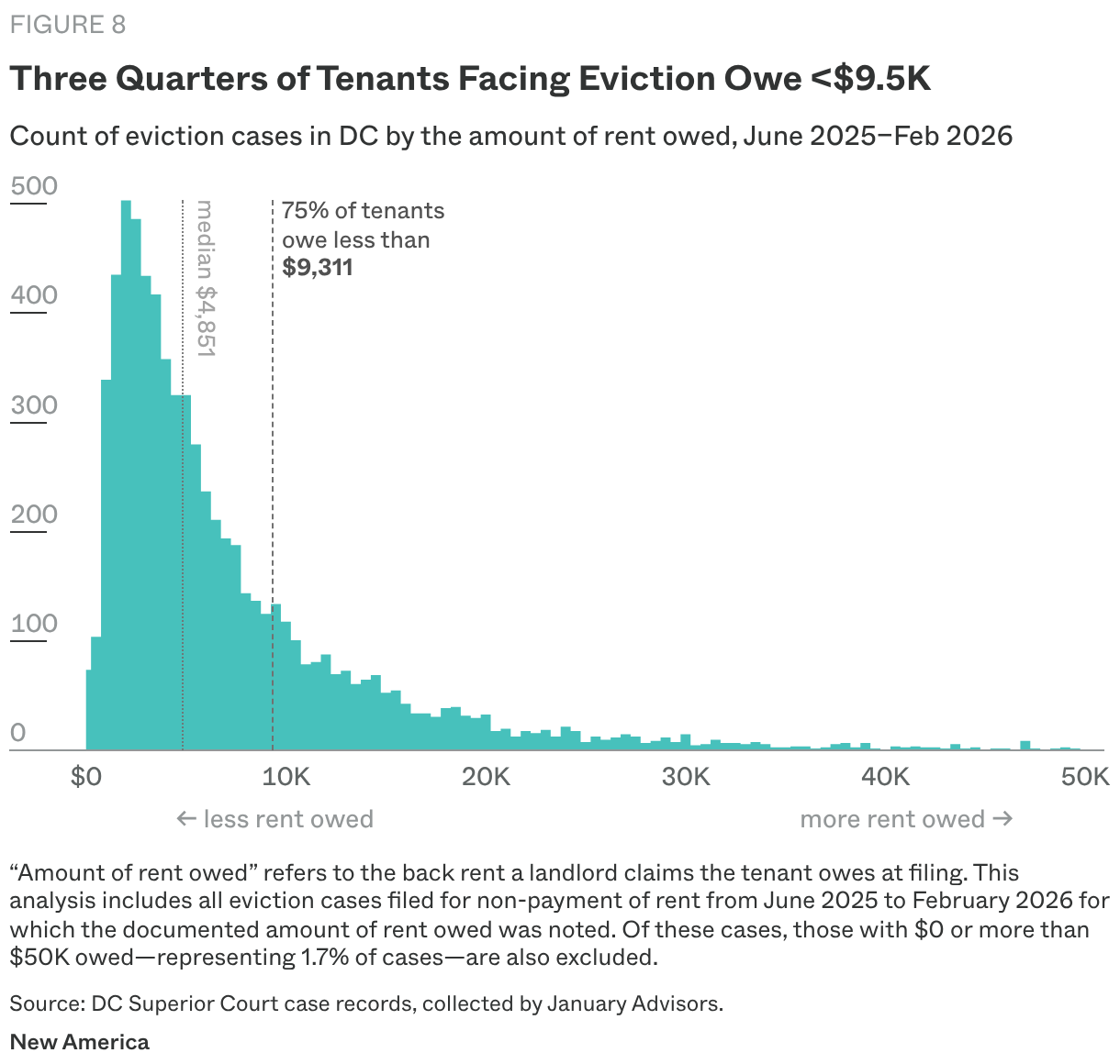 The median amount of back rent owed by tenants at the time of an eviction filing between June 2025 and February 2026 was $4,851. As illustrated by Figure 8, half of tenants with a filing from this time period owed less than $4,851 at the time of filing, and three-quarters owed less than $9,311.