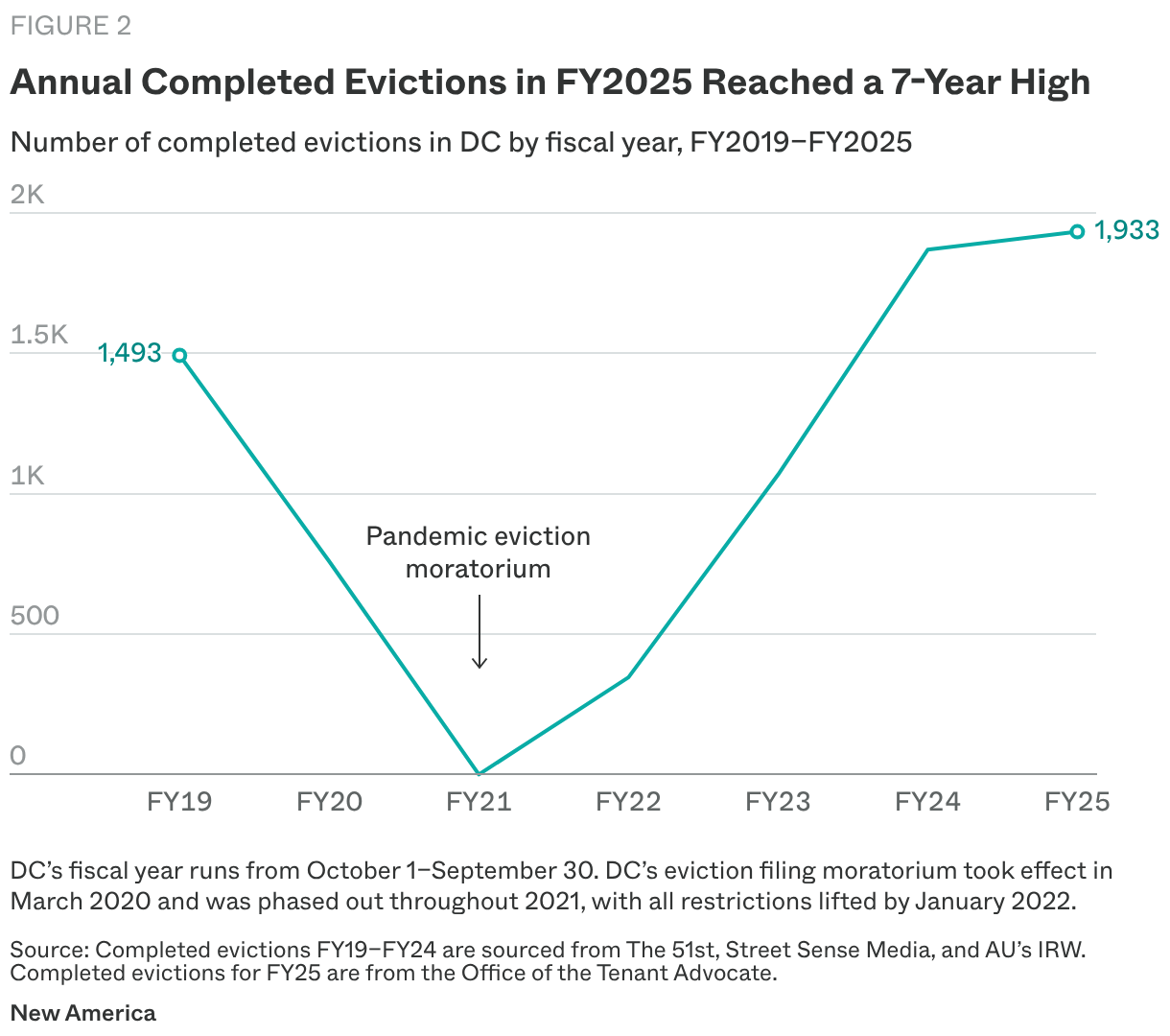 As shown in Figure 2, in fiscal year (FY) 2025, there were 1,933 completed evictions in DC, representing a seven-year high. In FY 2019—the only pre-pandemic year for which data is available—there were 1,493 completed evictions. From FY2019 to FY2025, completed evictions increased by 23 percent.