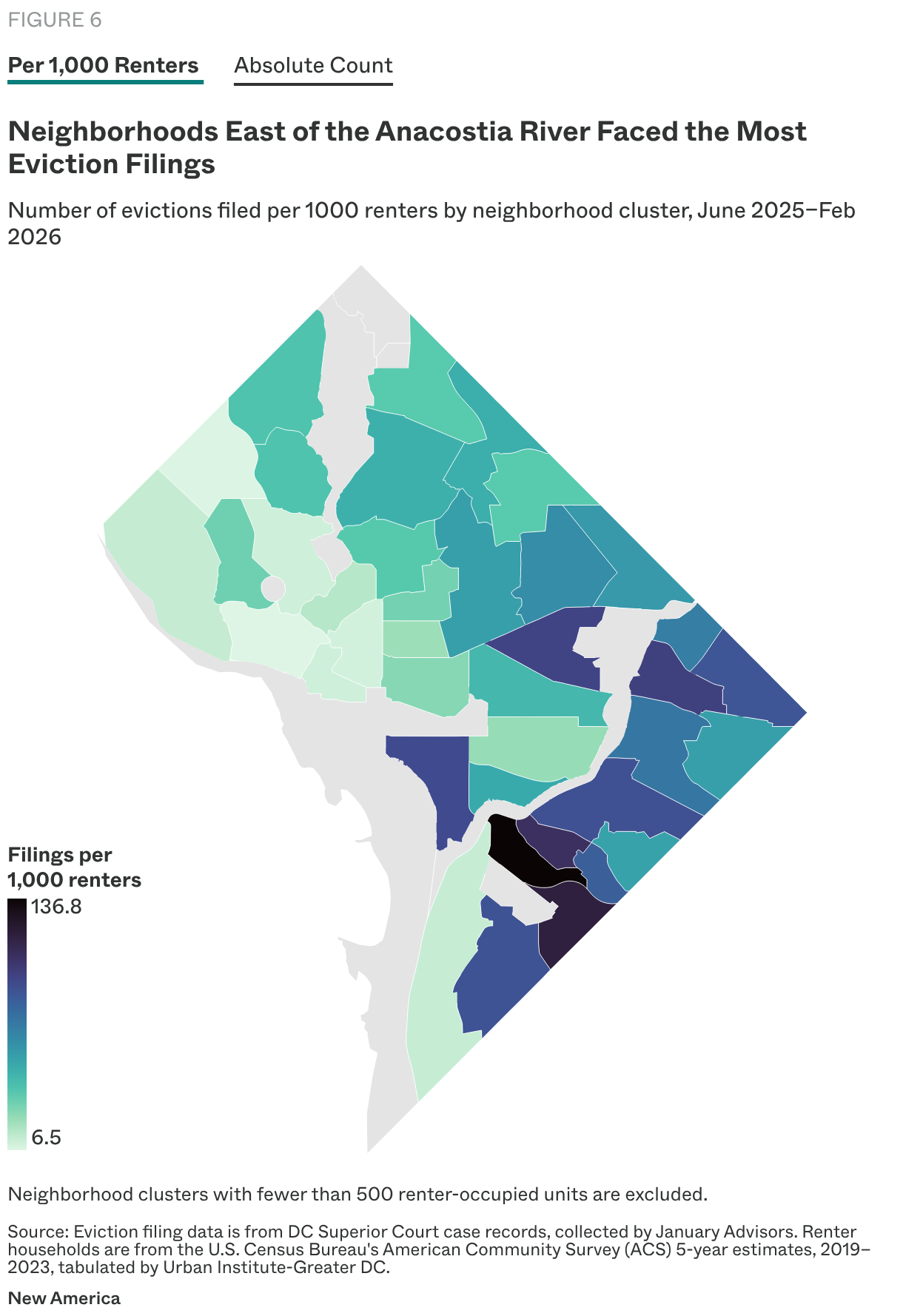 Hardest-hit neighborhood clusters: Figure 6 maps eviction filings per 1,000 renter households,1 and the total number of eviction filings, in each neighborhood cluster. The “per 1,000 households” view shows that neighborhood clusters in Wards 7 and 8 have high filing frequencies.