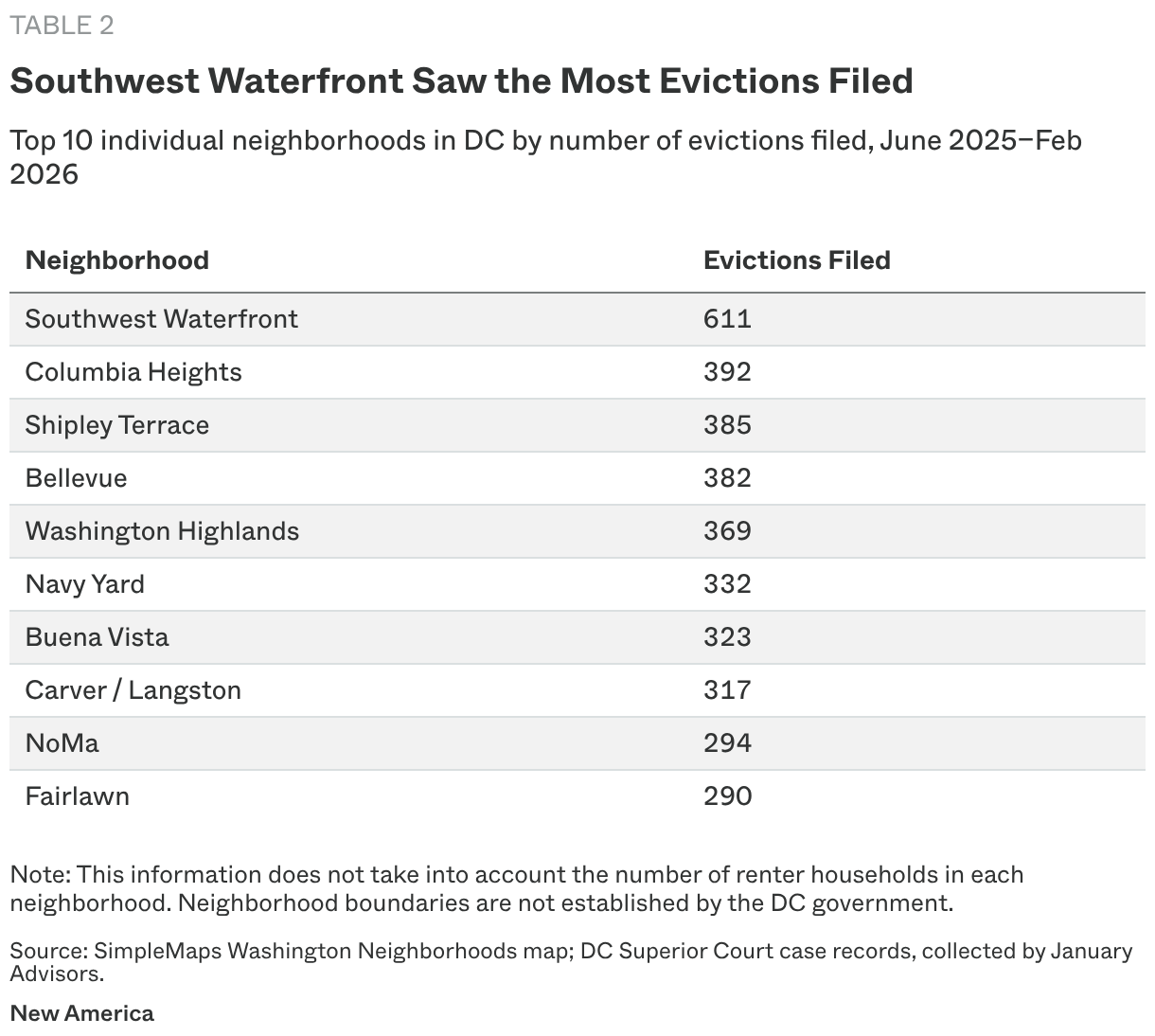 Hardest-hit individual neighborhoods: Between June 2025 and February 2026, Southwest Waterfront (Ward 6) was the individual neighborhood with the most eviction filings in the city, followed by Columbia Heights (Ward 1) and Shipley Terrace (Ward 8). Individual neighborhoods with the highest filing counts cover all four of the city’s quadrants and span Wards 1, 5, 6, and 8. Just five individual neighborhoods accounted for 22.5 percent of the city’s eviction filings over this nine-month period.