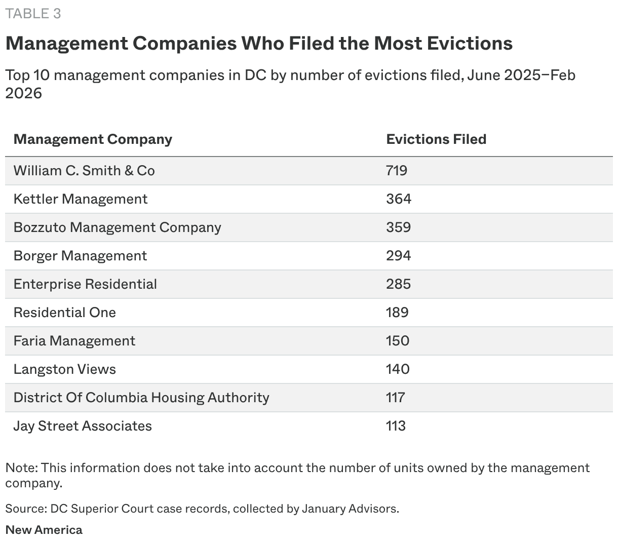 Between June 2025 and February 2026, the top five management companies were responsible for 21 percent of the city’s eviction filings. Several of these companies manage or own multiple large apartment buildings in DC, and the volume of filings in part reflects their large portfolios. Without data on the number of units per property management company or per apartment building, we are not able to assess the frequency of filings per household in their portfolios.