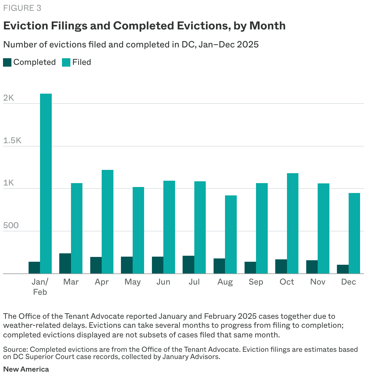 DC saw a monthly average of 1,065 eviction filings and 162 completed evictions in 2025, as shown in Figure 3. April 2025 saw the highest number of eviction filings in 2025 (1,222), while August had the lowest (950). Completed evictions peaked in March 2025 (238)—potentially due to a backlog postponed due to winter weather—and reached their lowest point in December 2025 (104).