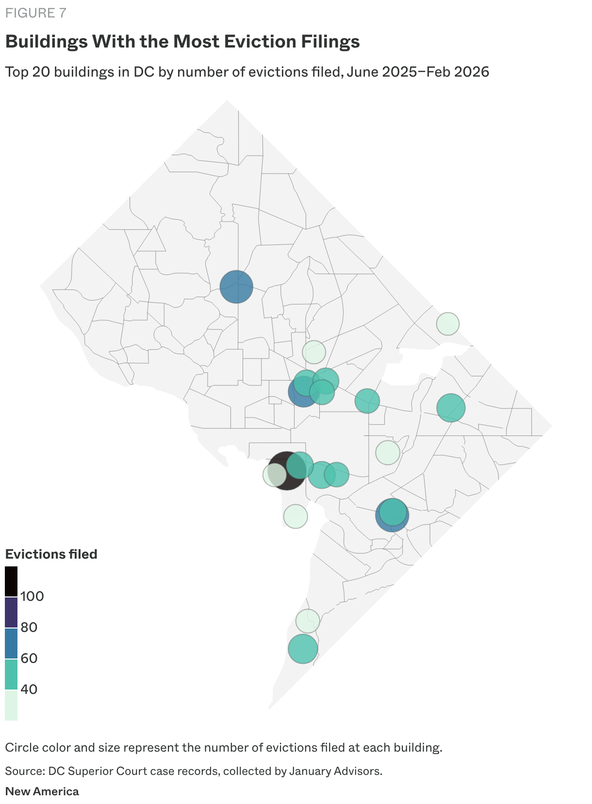 Figure 7 below maps the 20 buildings in DC with the most eviction filings during this time period. Several of these buildings with the most filings are owned by the same management company.