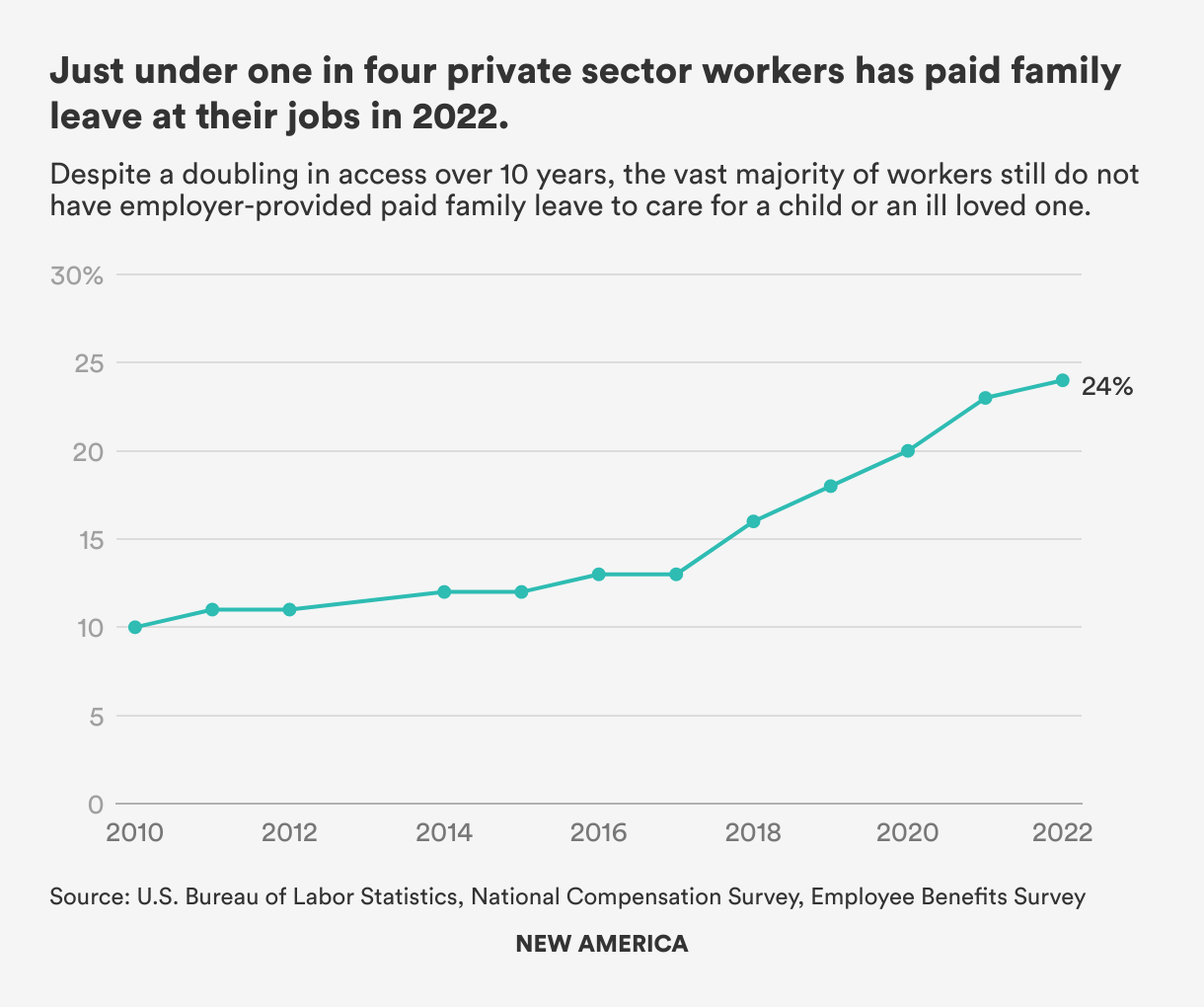 According to the most recent March 2022 data from the Bureau of Labor Statistics (BLS), just 24 percent of private-sector workers have paid family leave at their jobs through employer-provided benefits. It’s significant to see that access has more than doubled over the past decade – from 11 percent in 2012 to 24 percent in 2022. But that leaves nearly 92 million of the country’s 121 million private sector workers with no paid leave through their jobs.