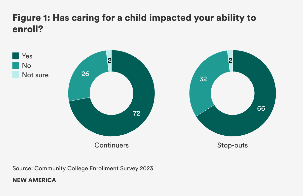 To learn how community colleges and policymakers can help more parenting students reach their educational goals, New America commissioned Lake Research Partners to survey a group of Americans with children under 12 who were enrolled in community college between January 2020 and July 2023. One group, which we call “continuers,” were still enrolled when the survey was conducted in November and December of 2023. Another group of “stop-outs” had not earned a degree and were no longer enrolled in community college by the time of survey. (Some students who enrolled in a community college between January 2020 and July 2023 had since graduated or transferred to a four-year program; these students were not included in this survey.)