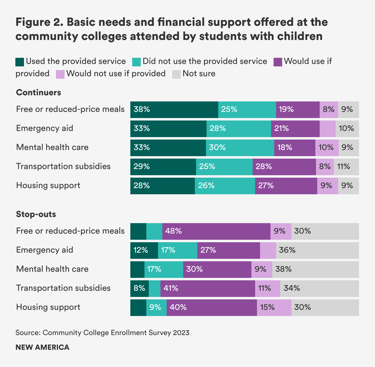 These trends suggest that support with basic needs, finances, and child care can be crucial for parents’ persistence. Most community colleges still have a long way to go in providing this assistance. Even many (around a quarter) of the caregivers who managed to continue their education said they would have used more supportive services, had they been offered. Given that stop-outs reported high rates of uncertainty regarding available services, community colleges need to do a better job ensuring students know about available help—in addition to providing more of that help.