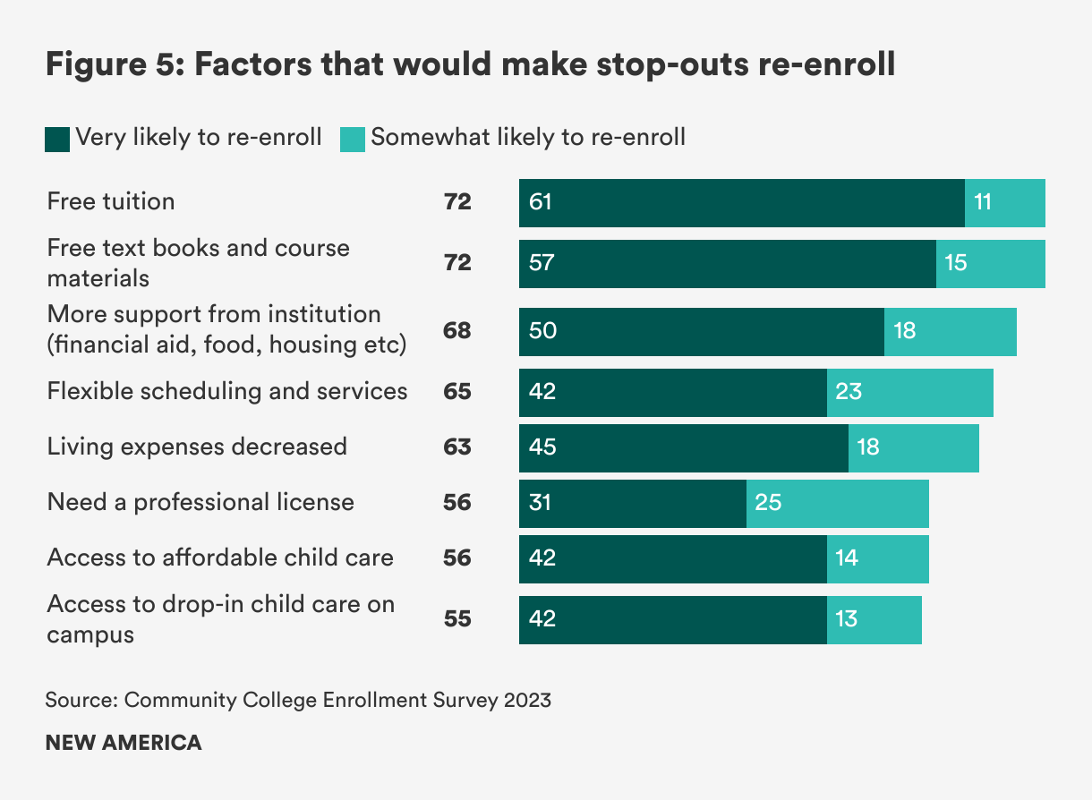 When asked what it would take to re-enroll, caregivers’ responses again highlighted the importance of financial, basic needs, and child care support (figure 5). Nearly three-quarters of stop-out caregivers said they would need free tuition and course materials. Other cost-related factors that caregivers said could bring them back to the classroom included decreased living expenses and more affordable tuition. Respondents also reported valuing in-kind services and support: 50 percent of the surveyed parents said more support from their college, such as academic support, health services, and food and housing support, would make them “very likely” to re-enroll.