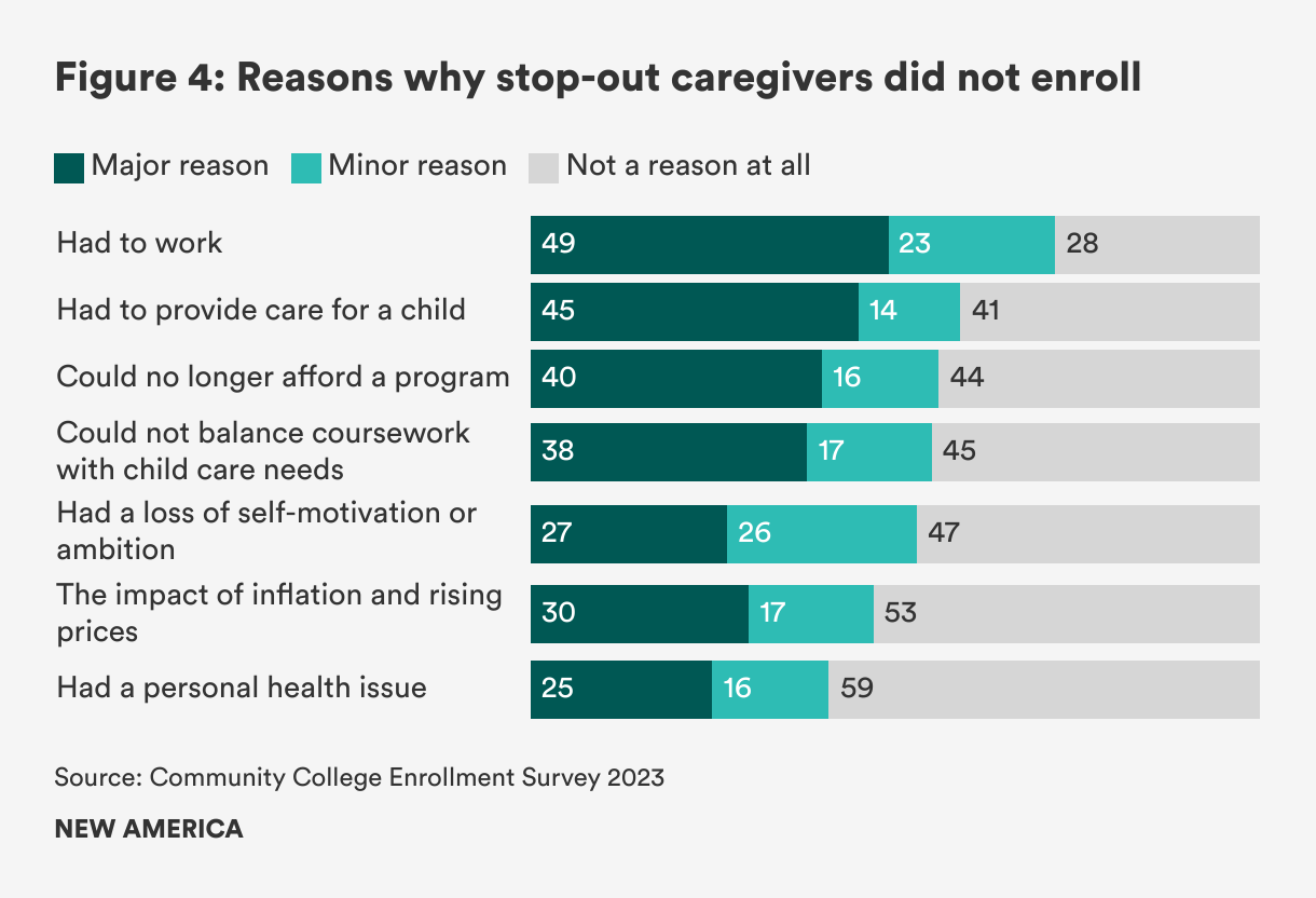 To further investigate what makes a difference for college persistence, we asked parenting stop-outs why they were no longer in community college. Nearly three in four caregiver stop-outs agreed that needing to work was a reason for not re-enrolling (figure 4). Additionally, over half of caregivers reported that not being able to afford the program was a factor in not re-enrolling. About 60 percent of caregiving stop-outs did not re-enroll partially because they needed to care for their child(ren) and 55 percent could no longer balance coursework with child care needs.