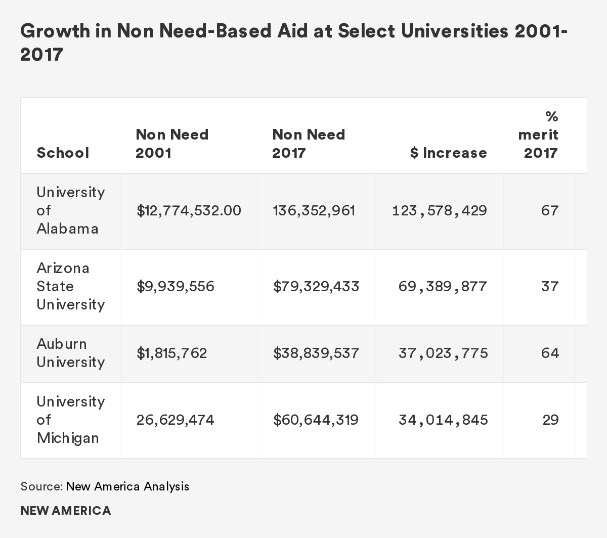 By contrast, there are other schools on the list – such as Arizona State and the University of Michigan – that still devote the bulk of their aid dollars to students with financial need.