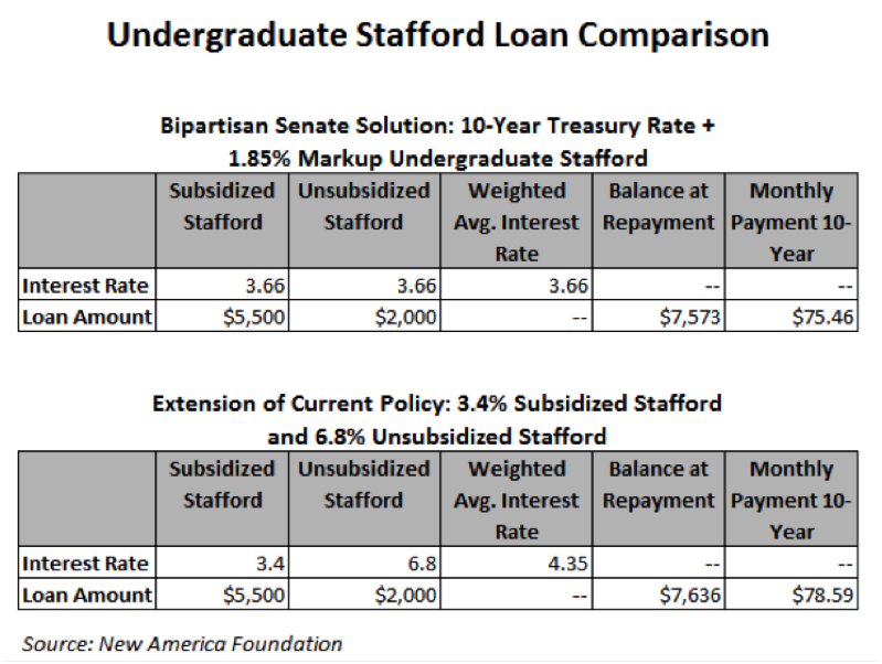 We’ve written a lot over the past few weeks about this bipartisan Senate proposal and in a recent analysis compare it to other plans. The benefits under the bipartisan plan exceed those of others proposals because it lowers rates on both types of loans undergraduates receive, Unsubsidized and Subsidized Staffords. And because Unsubsidized Stafford loans accrue interest while a student is in school, lowering rates on those loans reduces the amount of debt borrowers have when they leave school, cutting monthly and total payments, too.