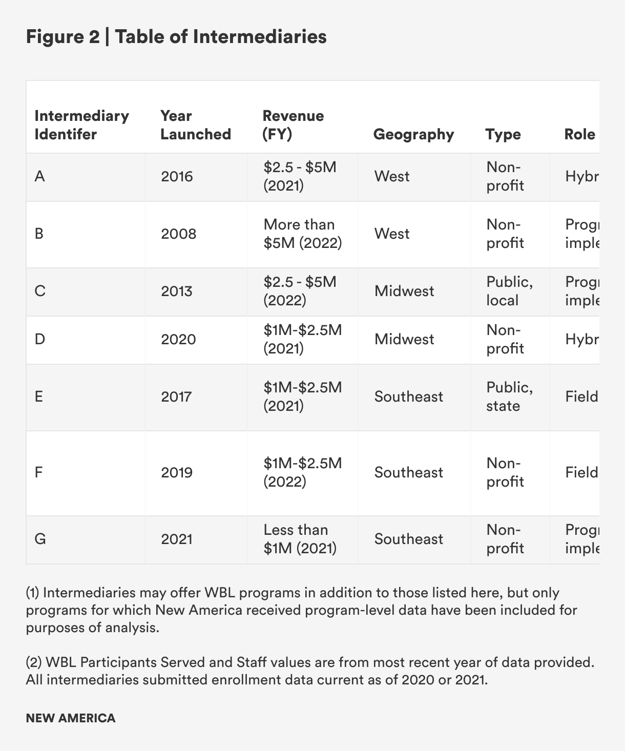 To understand how WBL intermediaries fund their operations and programs, New America and Kinetic West surveyed seven intermediaries offering structured work-based learning programs such as internships, pre-apprenticeships, and apprenticeships in different regions of the U.S.3 The intermediaries were selected to include a range of organizational longevity, place, type (e.g., nonprofit or public sector), size, and mission.