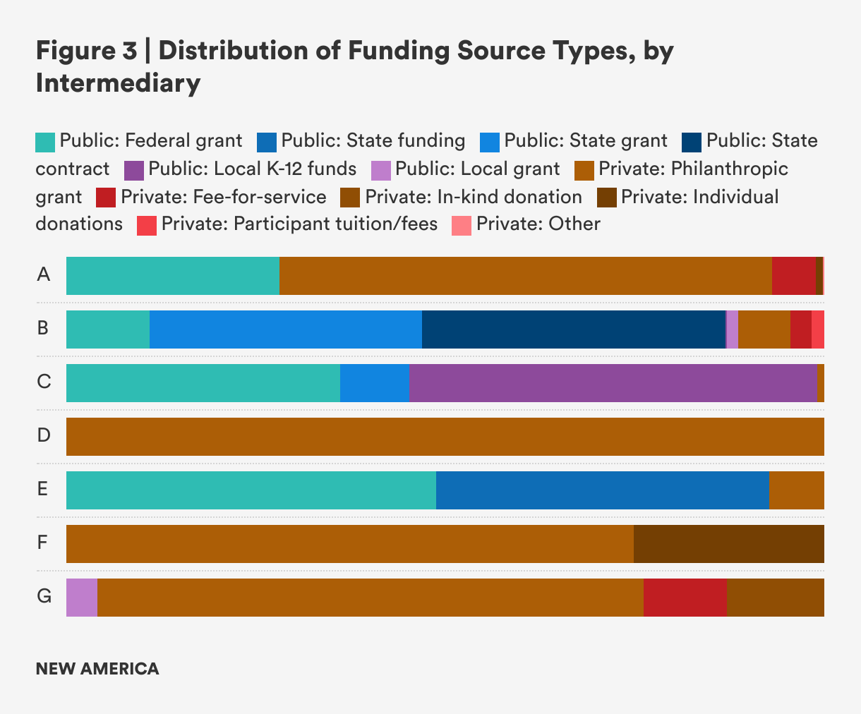 The intermediaries in this analysis rely heavily on time-limited grants from both public and philanthropic sources. Only three of the seven intermediaries in this analysis reported public formula-based funding as part of their intermediary revenue. And for those that have developed fee-for-service revenue streams or receive in-kind donations, those sources made up a small portion of overall revenue.