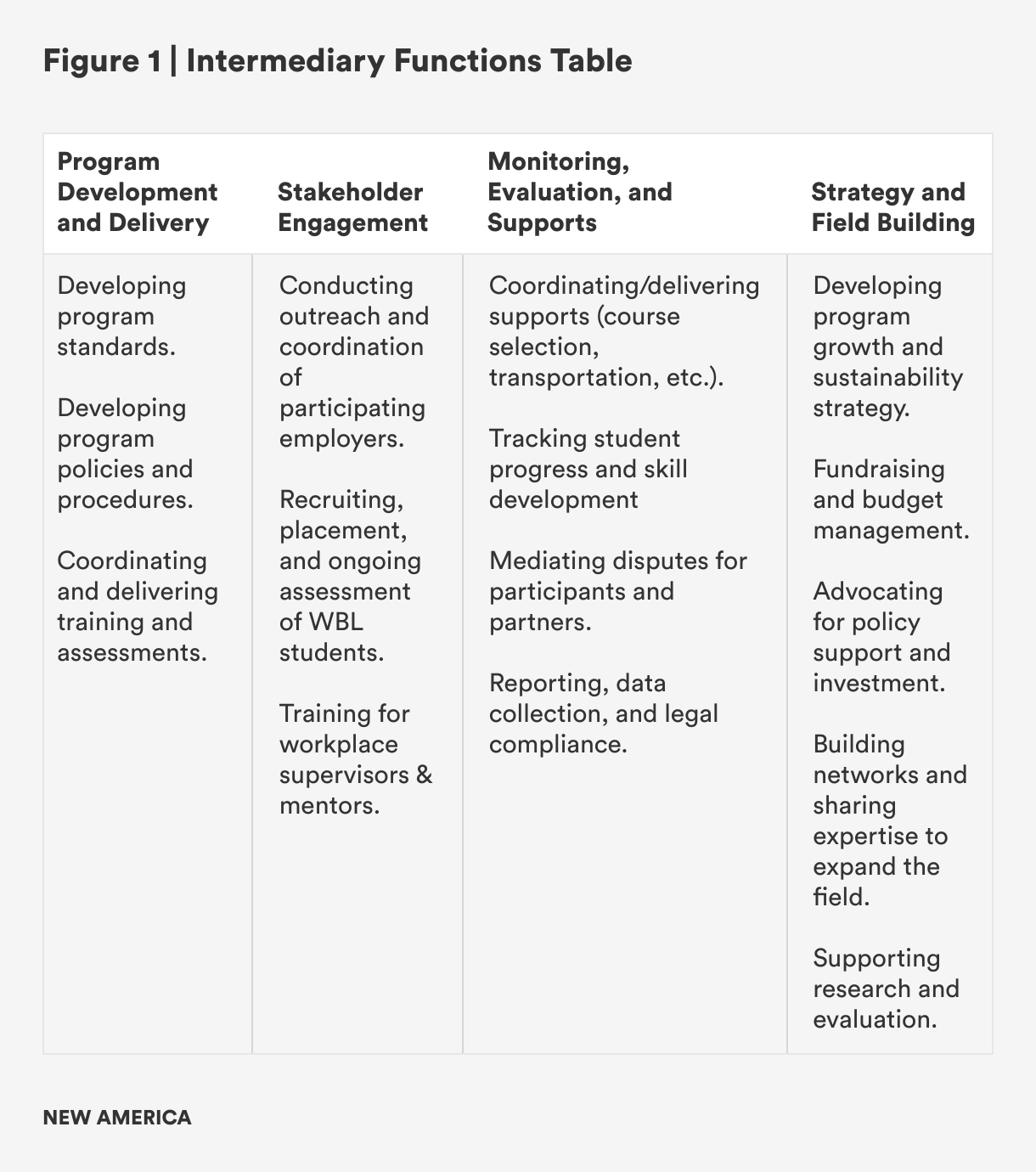 Regardless of their location or scope, WBL intermediaries play an important coordination and translation role among program partners (Figure 1). They work to establish a shared vision, to facilitate communication between stakeholders, and to coordinate implementation in a way that yields benefits for all stakeholders. WBL intermediaries commonly serve functions in the areas of program development and delivery; stakeholder engagement; monitoring, evaluation, and support services, and field building.