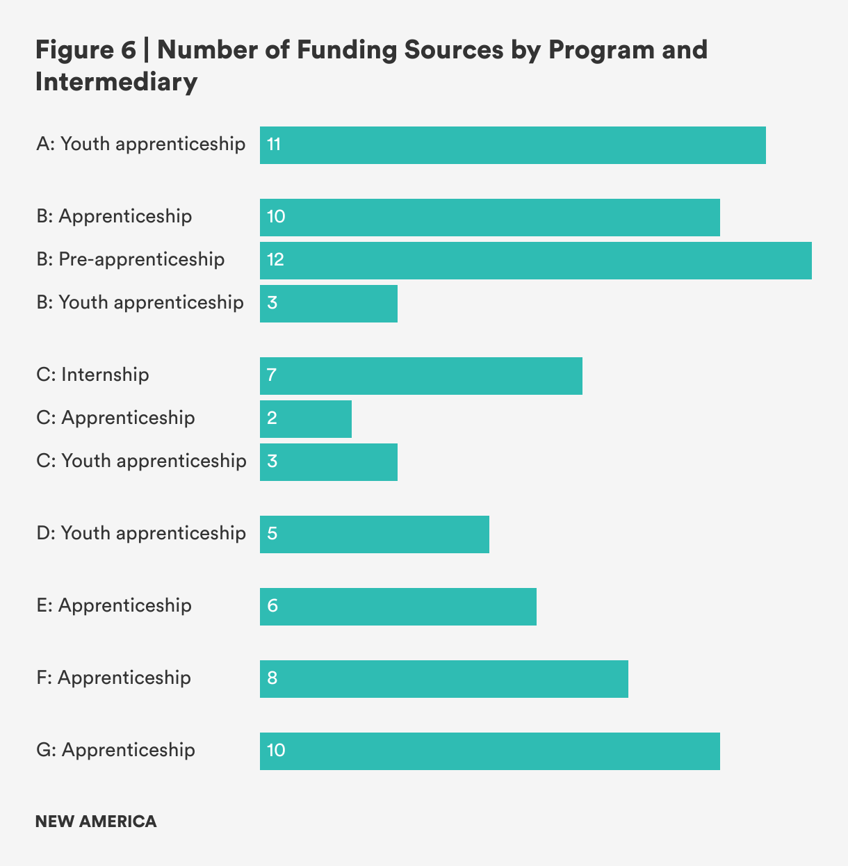 Braiding is especially complex at the program level (Figure 6). On average, intermediaries in this analysis braid seven sources to fund individual WBL programs. Some drew on as many as 12 distinct sources; others relied on just two. Even within the same intermediary, programs draw on different combinations of funds, adding complexity to these budgets.