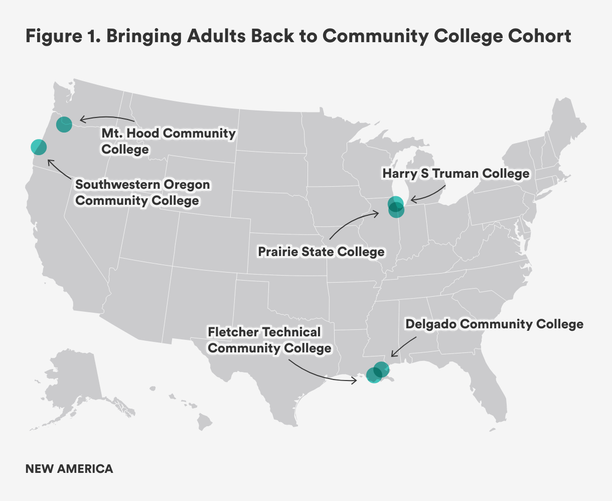 To help address this critical problem, the Center on Education & Labor at New America has partnered with six community colleges to help re-enroll adult students who have stopped out of college since the beginning of the COVID-19 pandemic. These colleges are: