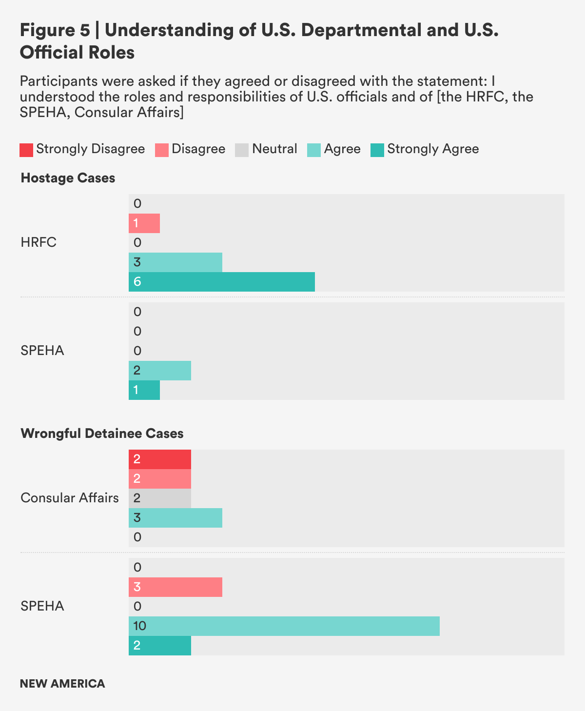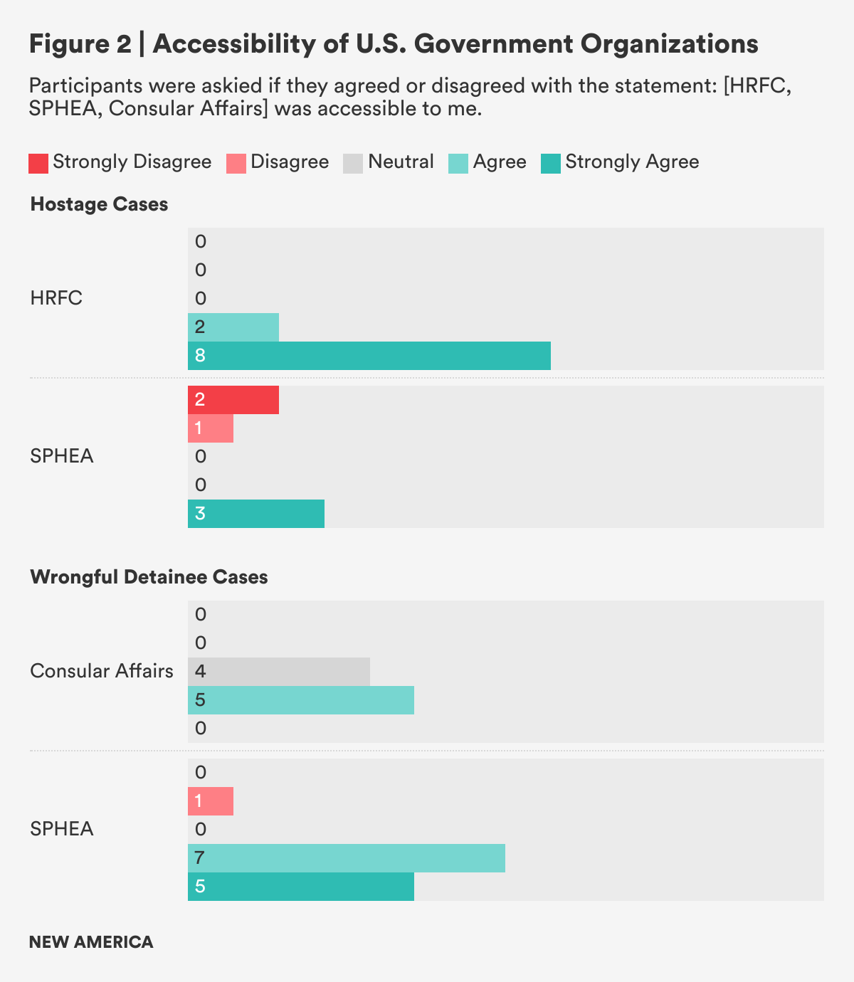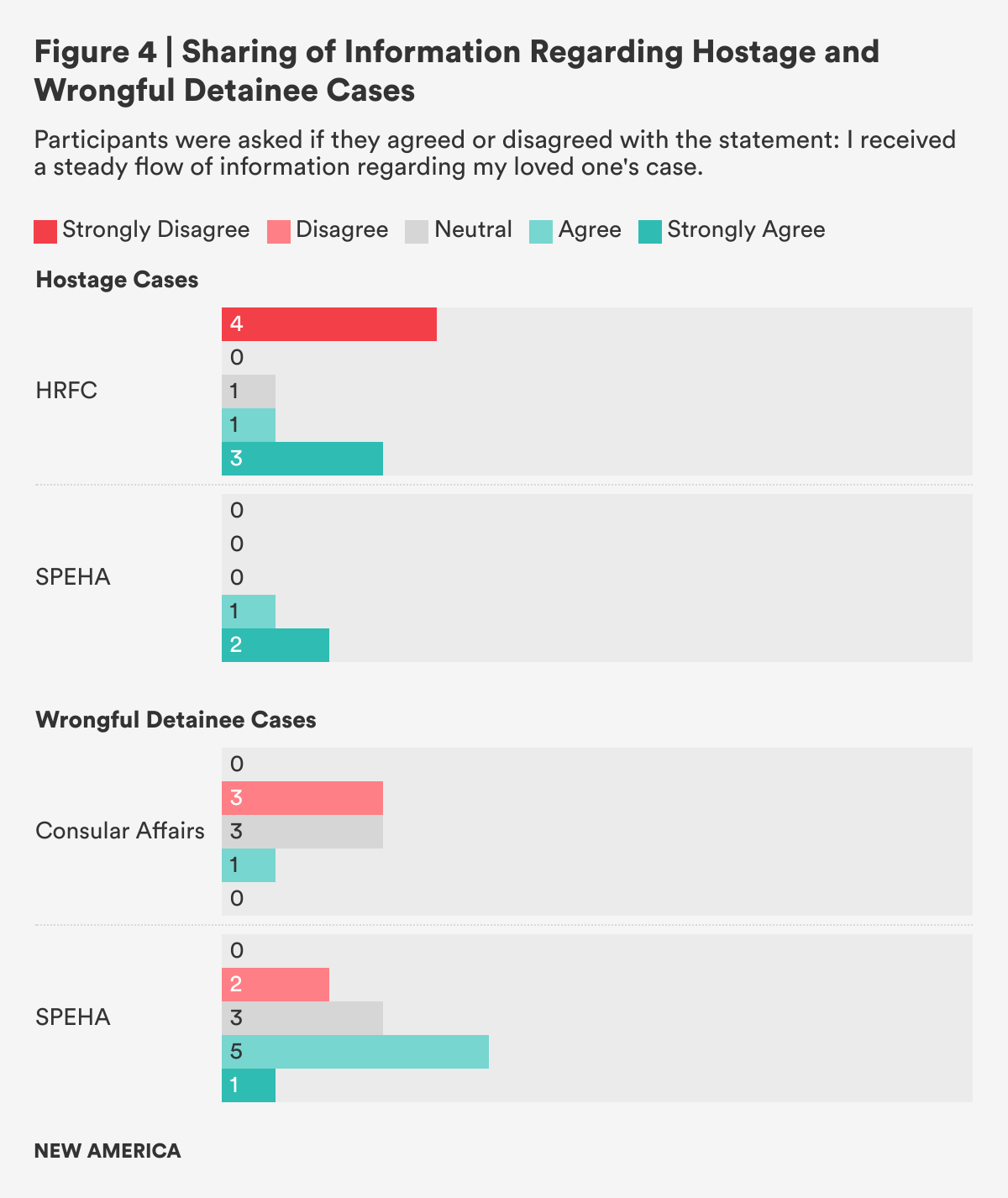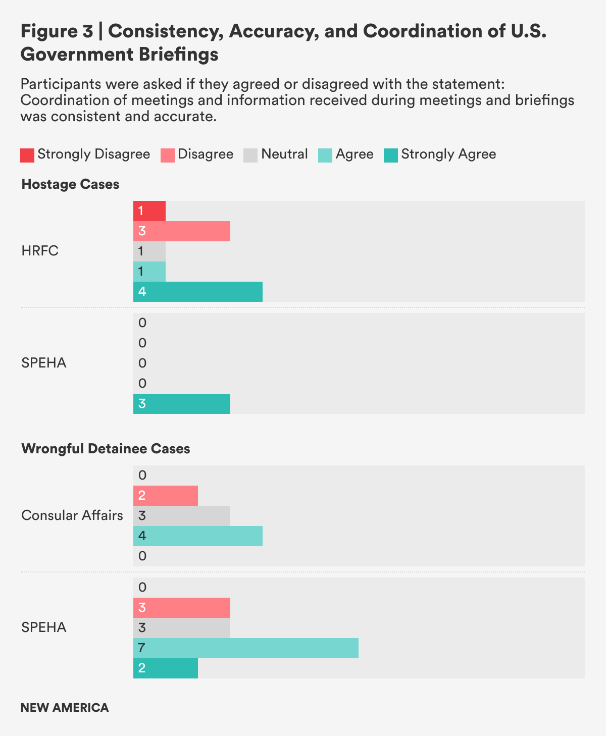 - Unlawful or wrongful detainee participants shared that it took eight months to two and a half years to gain access to the SPEHA’s office. Without access to the SPEHA’s office, these cases often languish in Consular Affairs alongside thousands of lawful detentions that occur overseas each year, getting the standard treatment of wellness visits, but not diplomatic advocacy for their favorable resolution. For these lawful detentions, adjudication through the foreign government’s judicial system is highly likely, but unlawful or wrongful detentions are far less likely to receive any judicial process, let alone due process. This is because these unlawful or wrongful detentions typically occur in countries where the foreign governments show hostility towards the United States and the U.S. nationals are being held to affect changes in U.S. policy, force prisoner exchanges, and/or extract other forms of political concessions from the United States. The complex nature of the relationships between the United States and these countries requires both high-level diplomatic engagement and the prioritization of unlawful or wrongful detainee recovery in the relationship with these countries. In addition, while they are being held, unlawful or wrongful detainees undergo continuous interrogations, experience inhumane treatment such as living in unsanitary conditions, solitary confinement, and some undergo physical and psychological torture. Therefore, unlawful or wrongful detention cases must receive high-level U.S. government and SPEHA diplomatic engagement as well as prioritization within the interagency, something that is not in the remit or practice of Consular Affairs. Delaying access to the SPEHA’s office slows the resolution of these cases and increases the trauma suffered by the detainees and their families. The U.S. government should reconsider how cases are assessed and the process of reassignment to the SPEHA’s office in order to reduce unnecessary trauma to the families and reduce the time each case spends being vetted by Consular Affairs.