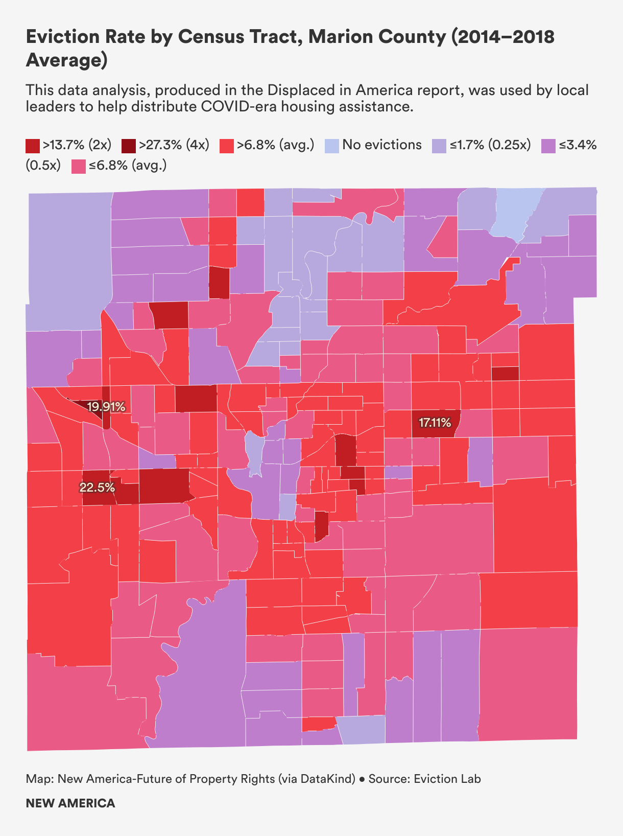 At the outset of the COVID-19 pandemic in March 2020, for example, the Deputy Mayor of Indianapolis had to distribute $15 million of Coronavirus Aid, Relief, and Economic Security (CARES) Act funding across the city to keep people stably housed. Using census-tract level heat maps of evictions and foreclosures from the five years prior to the pandemic (2014–2018), city leaders were able to see which neighborhoods had historically been hardest hit by housing loss as a way to determine how to allocate this federal housing aid.