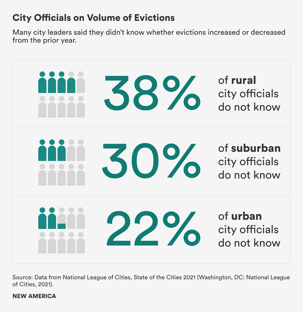 And yet, these devastating events happen in the shadows. The federal government does not collect and share data on evictions or foreclosures. In 2021, a survey from the National League of Cities found that 38 percent of rural officials, 30 percent of suburban officials, and 22 percent of urban officials didn’t know whether evictions had increased or decreased in the prior year,3 let alone where within their cities evictions were most acute, how rates changed over the course of the year, or who was most at risk.