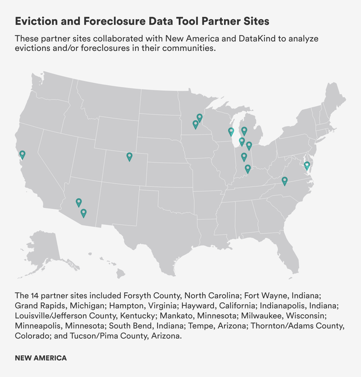 Working locally over the last five years, New America has collaborated with over two dozen cities and counties and three states to build their capacity to access and analyze eviction and foreclosure data. These insights have led to direct action on the ground.