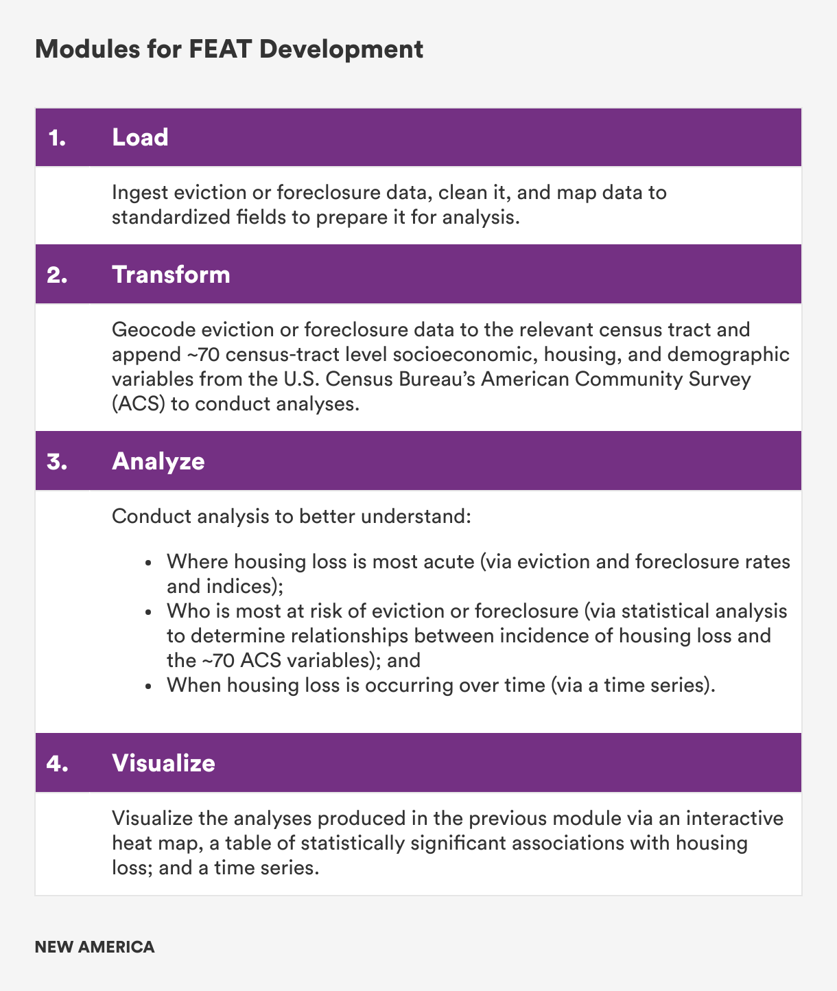 In 2021, New America’s Future of Land and Housing program and DataKind developed a beta version of FEAT, which was housed in a Github repository and could be downloaded and run on local court-generated eviction or foreclosure data using the programming language Python.