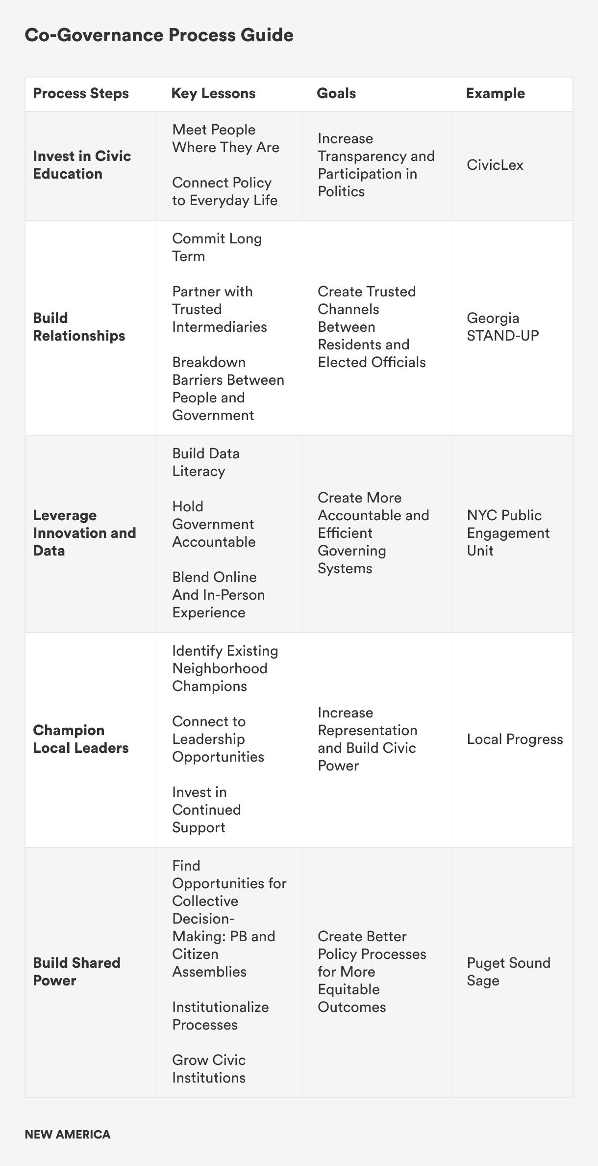 Of course, deploying these models is not easy or automatic. Each case provides lessons for building effective collaboration between communities and politicians and redistributing political power—not only lessons on what works but also what does not. We seek to distill and elevate these lessons and best practices into a toolkit to help local leaders navigate co-governance in their communities.