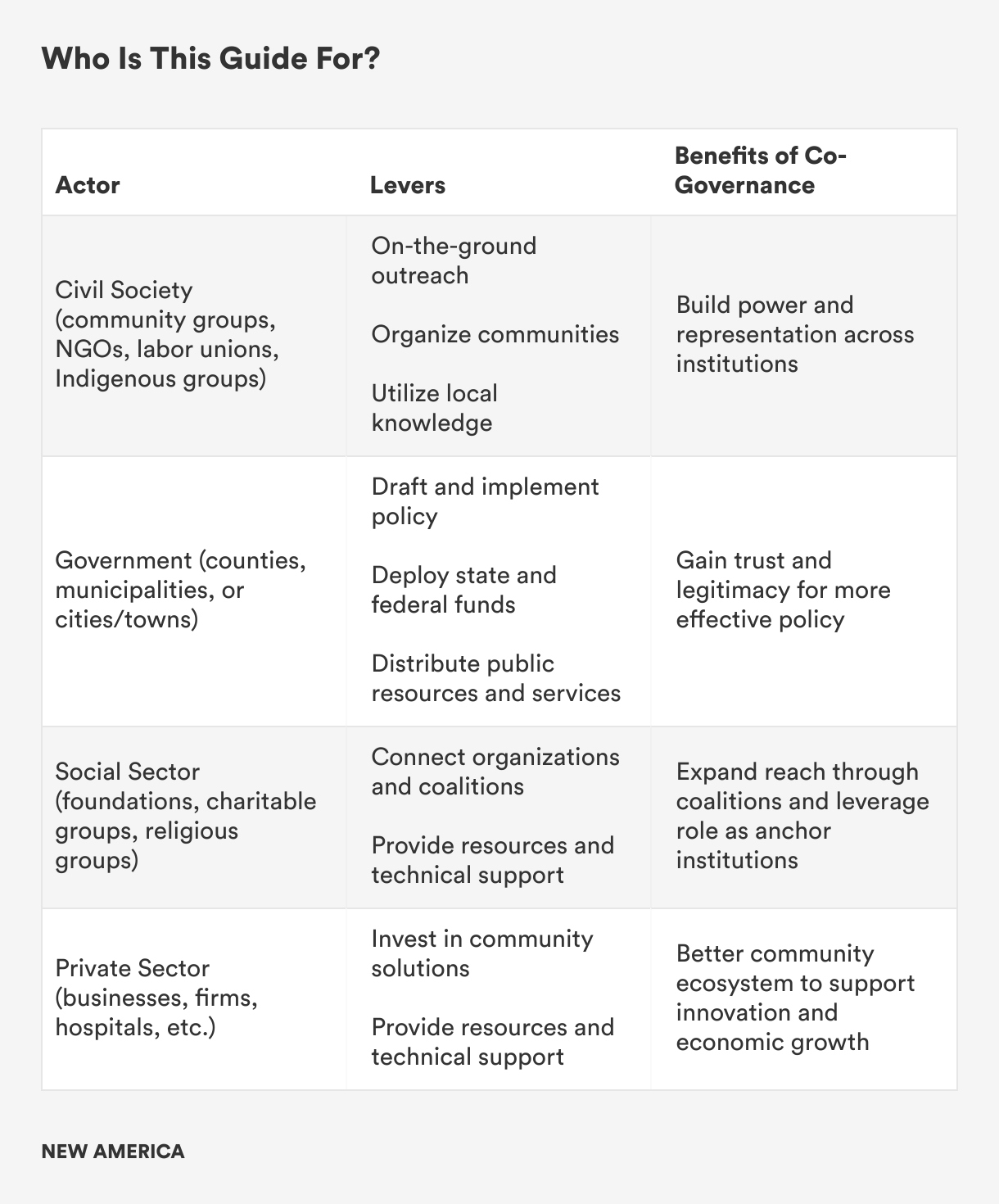 The unprecedented influx of federal funding to communities presents a once-in-a-generation opportunity for reimagining the relationship between community residents and their local, state, and national government. Through programs such as the Inflation Reduction Act and the Infrastructure and Investment Jobs Act, which encourage states and municipalities to embrace meaningful community engagement strategies and support community-led projects, new resources and incentives exist for local agencies to implement co-governance strategies in collaboration with community leaders. Local government officials now have the responsibility to ensure federal resources are connected to the communities they are intended to serve. The intention of this toolkit is to help inspire government actors to build community partnerships and center civic power in decision-making and resource allocation.