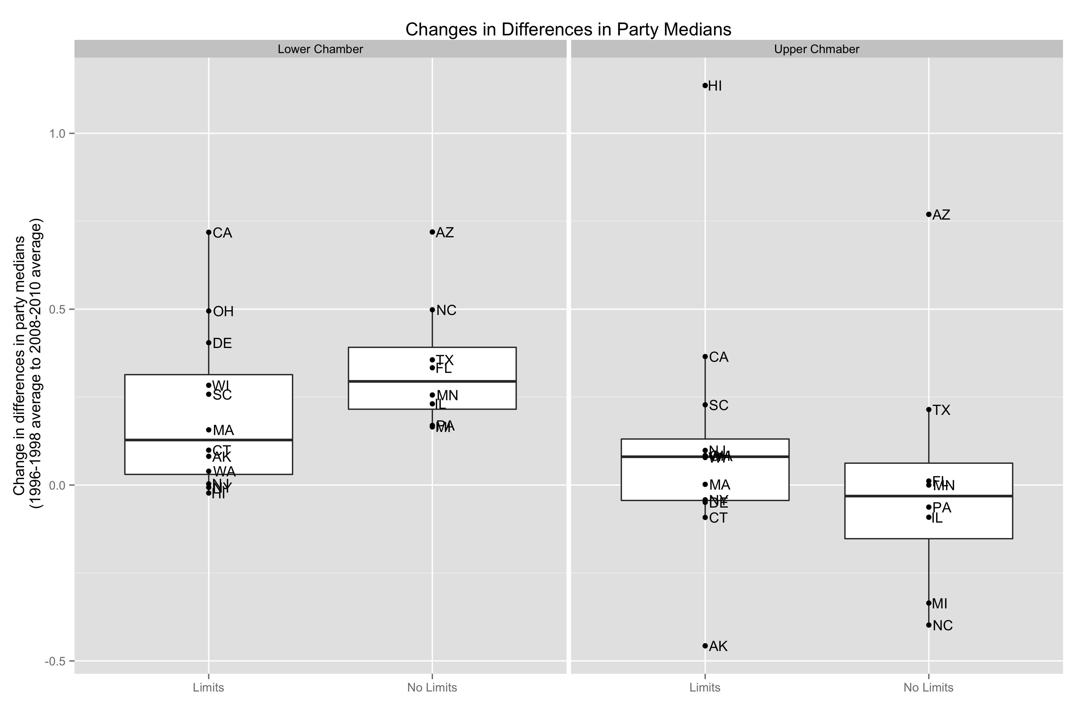 If we expand from 20 states to all states, the basic conclusion stays the same. States without limits are slightly more polarized than states with limits. The median of the differences in party medians in lower chambers decreases from 0.37 to 0.16; the median of the differences in party medians in the upper chambers increases from 0.09 to 0.21.
