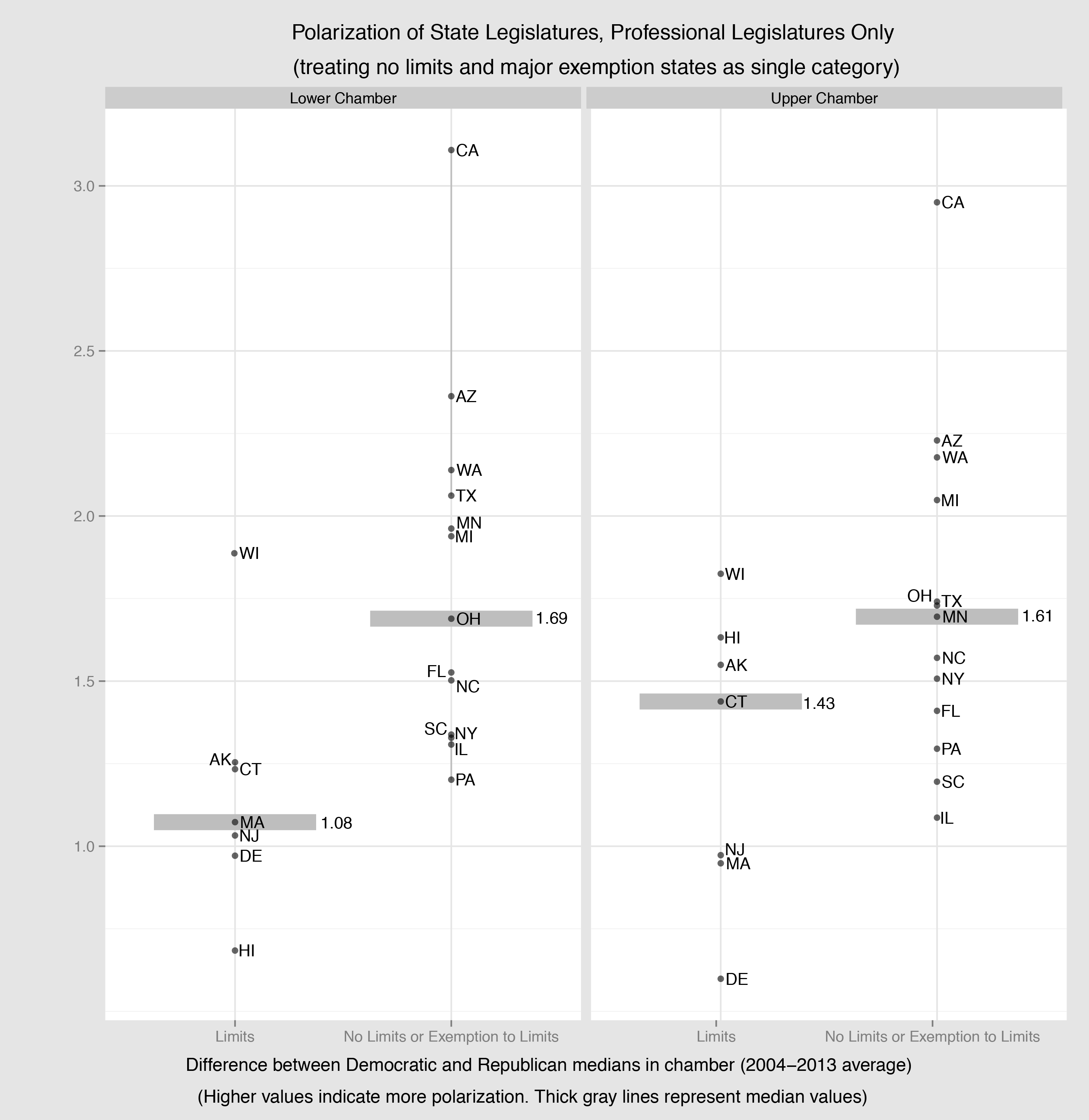 Figure 3. Differences in party medians, by chamber, professionalized states only, treating states with exemptions and no limits equally.