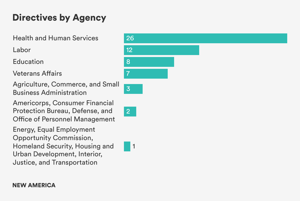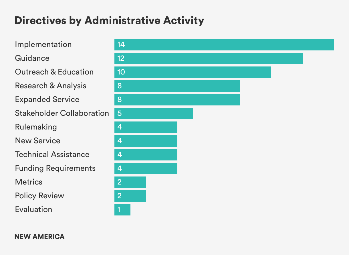 Less frequent but important directives request that agencies engage with stakeholders, issue formal rules, provide technical assistance, collect data, review policy, and conduct evaluations. Each of these activities will require differing kinds of expertise within agencies, and coordination across multiple departments within agencies, and even across multiple agencies.