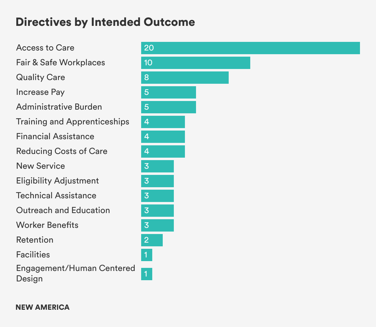 A little over half of the directives specifically relate to improving the experiences of paid and unpaid caregivers, while the remainder focus on internal processes that will help government be more responsive to caregiving populations, and care recipients. Directives aimed at helping the care workforce- all sectors- are primarily concerned with increasing pay, ensuring fair and safe working conditions and benefits, and providing training opportunities. For people requiring care, directives focus on increasing access to services, improving quality of care, and reducing costs. To a lesser degree, directives are aimed at expanding choices and eligibility, reducing administrative burden, or providing other types of support like assistance with care planning.