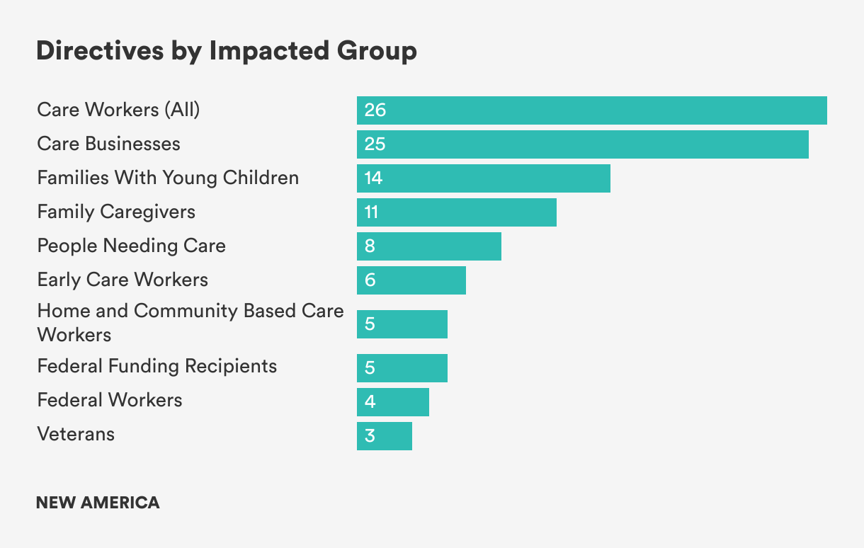 Almost a quarter of all care order directives aim to improve access and/or quality of care for families with young children, while a slightly lower number focus on family caregivers to older adults and people with disabilities. Directives focusing on the disabled, veterans, tribes, care businesses, and federal workers (permanent and project funded) are less frequent but together represent a notable segment of important populations.