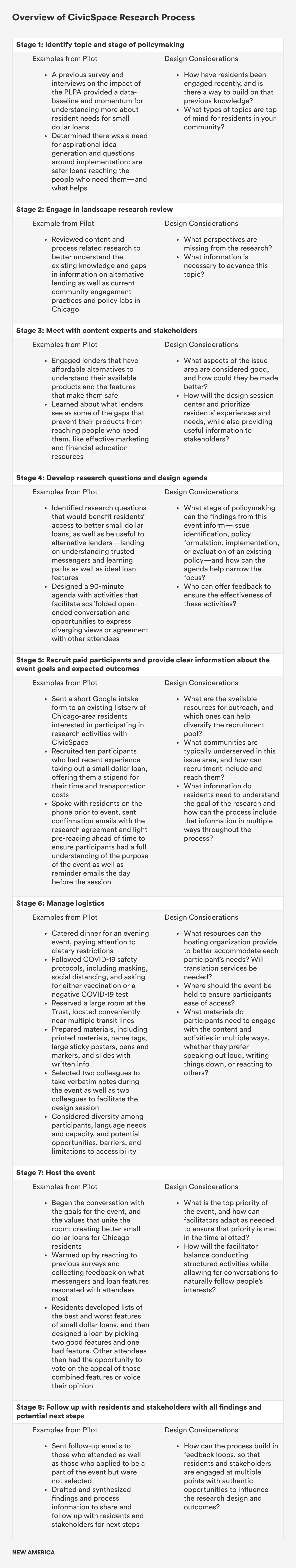 In the table below, you’ll find an overview of the general research process timeline CivicSpace undertook and some considerations for each stage.