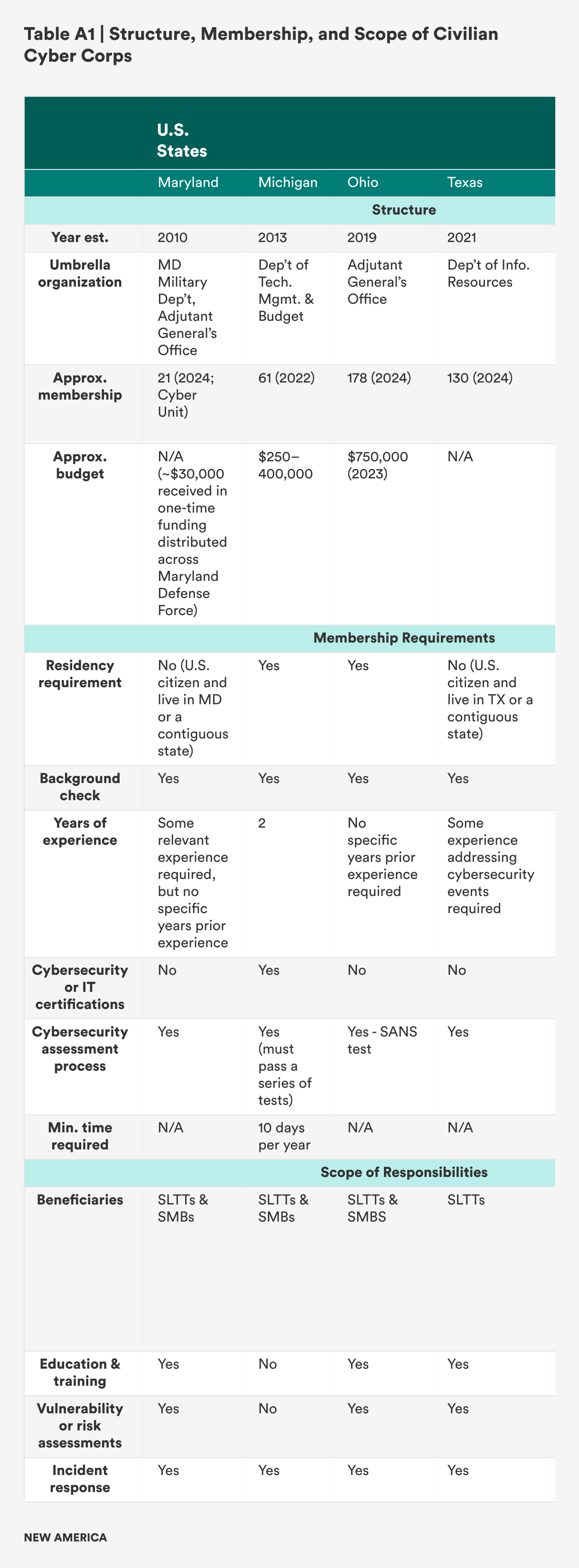 While federal action has stalled, states have established C3s (see Appendix 1). First, in 2010, Maryland established a Cyber Security Unit (CYSEC) within the Maryland Defense Force, a volunteer force that supports the state’s National Guard and emergency management agency. Then, in 2013, Michigan established the Michigan Cyber Civilian Corps (MiC3) “to provide mutual aid to all levels of government, education, and business organizations in the State of Michigan in the event of a critical cyber incident.”32 In 2014, Wisconsin utilized funding from the U.S. Department of Homeland Security (DHS) to establish a volunteer Cyber Response Team (CRT). In 2019, Ohio formed the Ohio Cyber Reserve (OhCR) to engage in (1) outreach, training, and education (including for K–12 education efforts); (2) security assessments to reduce vulnerabilities and increase resiliency; and (3) response to cyber incidents at eligible governmental and critical infrastructure entities. Most recently, in 2021, Texas established the Texas Volunteer Incident Response Team (VIRT) to support state and local government entities in response to critical cybersecurity incidents.
