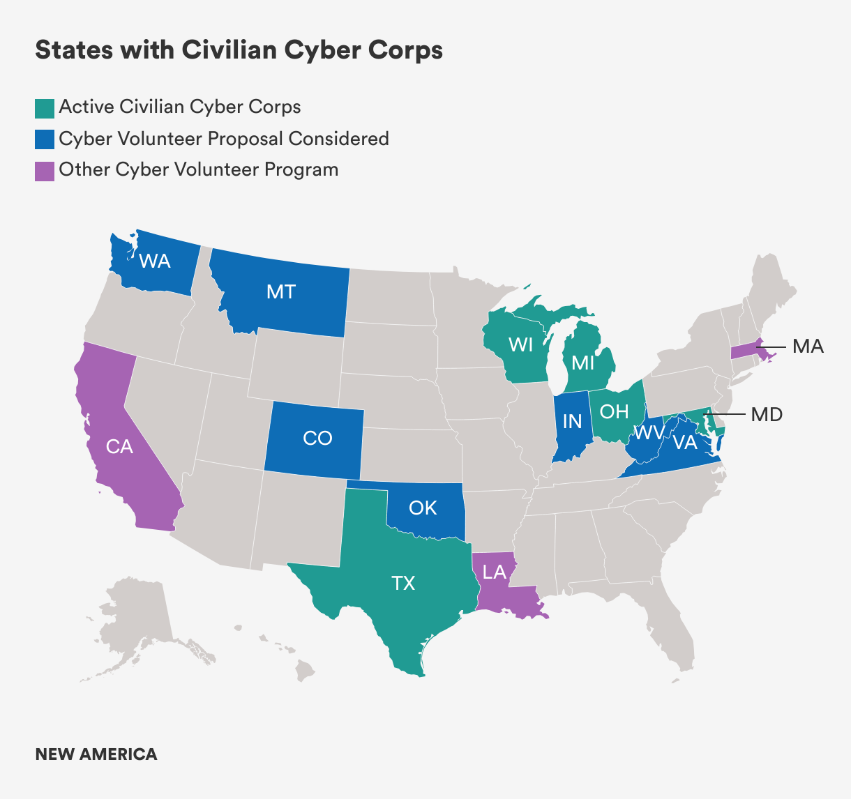Other states have organized cyber volunteers and similar initiatives as well. Oklahoma is in the process of developing the Oklahoma Civilian Cyber Corps (OKC3), a public grant-funded initiative to establish a dedicated volunteer team to provide incident response assistance to public entities in the state. In Massachusetts, in addition to existing cybersecurity programs such as the Municipal Cyber Association, the state is developing security operations centers and cyber ranges at various colleges and universities to improve local cyber resiliency and promote diversity in the cybersecurity workforce. California maintains a Cybersecurity Integration Center comprised of personnel from various state agencies and tasked with sharing threat intelligence and providing incident response services. Several other U.S. states, including Colorado, Hawaii, Indiana, Montana, South Carolina, Washington, West Virginia, and Virginia have considered establishing C3s.33