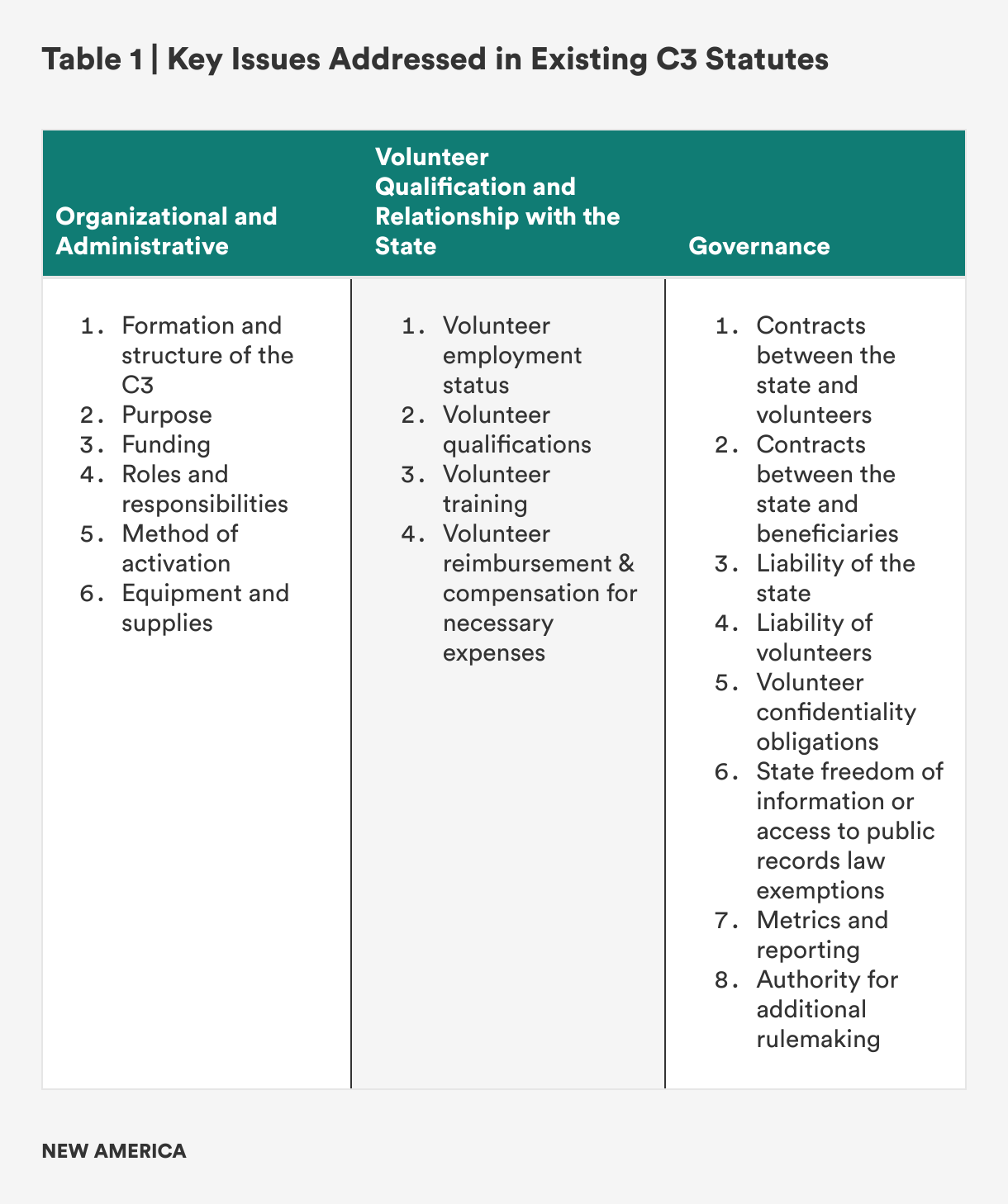 Second, states must develop and implement a legal framework to establish clear roles and responsibilities, allocate liability, ensure confidentiality, and establish rules for collaboration with other entities (including other states’ C3s), among other concerns. A statement issued by Virginia’s Governor vetoing a bill that would have required an assessment of the feasibility of a state C3, highlighted “continued financial obligations, background checks, liability protections, and ongoing recruitment” as well as potential conflicts with the National Guard’s duties as issues to be addressed before forming a C3.50 Other states considering developing C3s will have similar concerns, but because of differing legal, political, and cultural environments, what works in one state may not be directly transferable to another. A related issue arises from the use of cyber volunteers with respect to collaboration across entities within a state, between states, or with the federal government. Those engagements are typically carried out under MOUs that specify the scope of responsibilities. A similar structure can be utilized for C3s, but this issue should also be addressed in the relevant C3 law to make clear that MOUs should be used for this purpose.