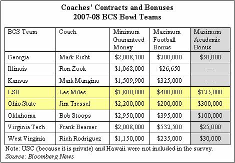 Jim Tressel, the coach of Ohio State, LSUs opponent in the National Championship game, could receive up to $300,000 in academic bonuses this yearor 14 percent of his $2.2 million contract. This is actually the largest academic bonus at any public schoolbut it doesnt seem to have had much of an effect on the academic performance of OSUs football team. OSUs most recently reported graduation rate for its football team is 48 percent, and its Academic Progress Rate of 928a real-time measure of how players are advancing towards degreesis only three points higher than the NCAA cut-off for penalties.