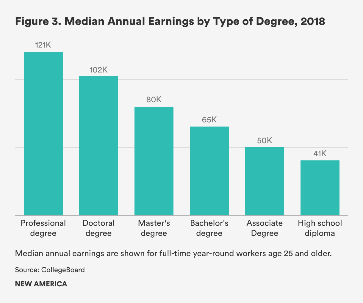 While college wage premiums are observable for workers of all ages, the economic returns to higher education differ by institution, type of degree, and program of study. In 2018, the median earnings of full-time workers aged 25 and older with bachelor’s degrees were $65,400. In the same year, the median earnings of full-time workers with associate's degrees were $50,100, and the median earnings of full-time workers with high school diplomas were $40,500. This shows that college completion – both at community colleges and four-year universities – is associated with increased earnings and economic security (see figure 3).