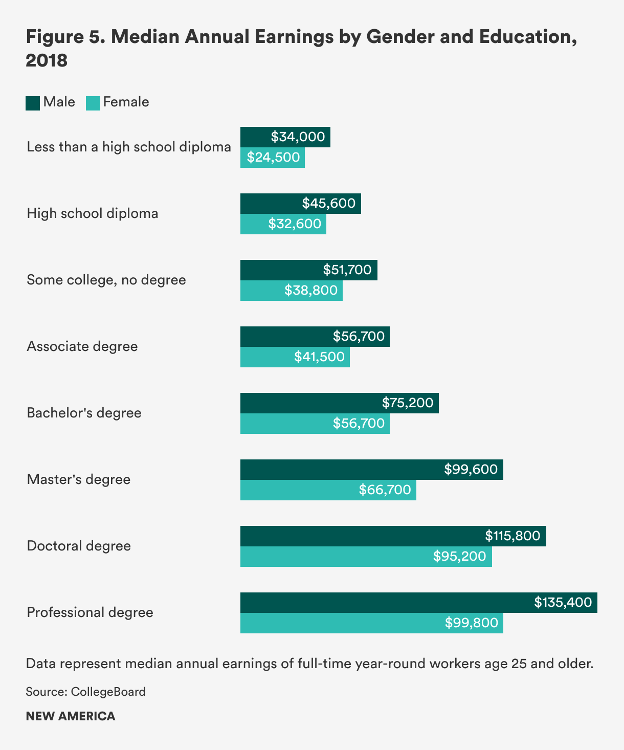 There are also significant gender inequities in the labor market outcomes of college graduates. Female workers aged 25 and older with associate’s degrees earned, on average, $41,500 in 2018, while their male counterparts earned an average of $56,700. In the same year, female workers with bachelor’s degrees made, on average, $56,700 while their male counterparts made, on average, $75,200. Gender inequities in labor market outcomes are so significant that, on average, male workers with bachelor’s degrees actually make more money than female workers with master’s degrees (see figure 5). While earning a college degree is associated with increased earnings for both male and female workers, earning a college degree will not solve systemic gender-based inequities in the labor market.